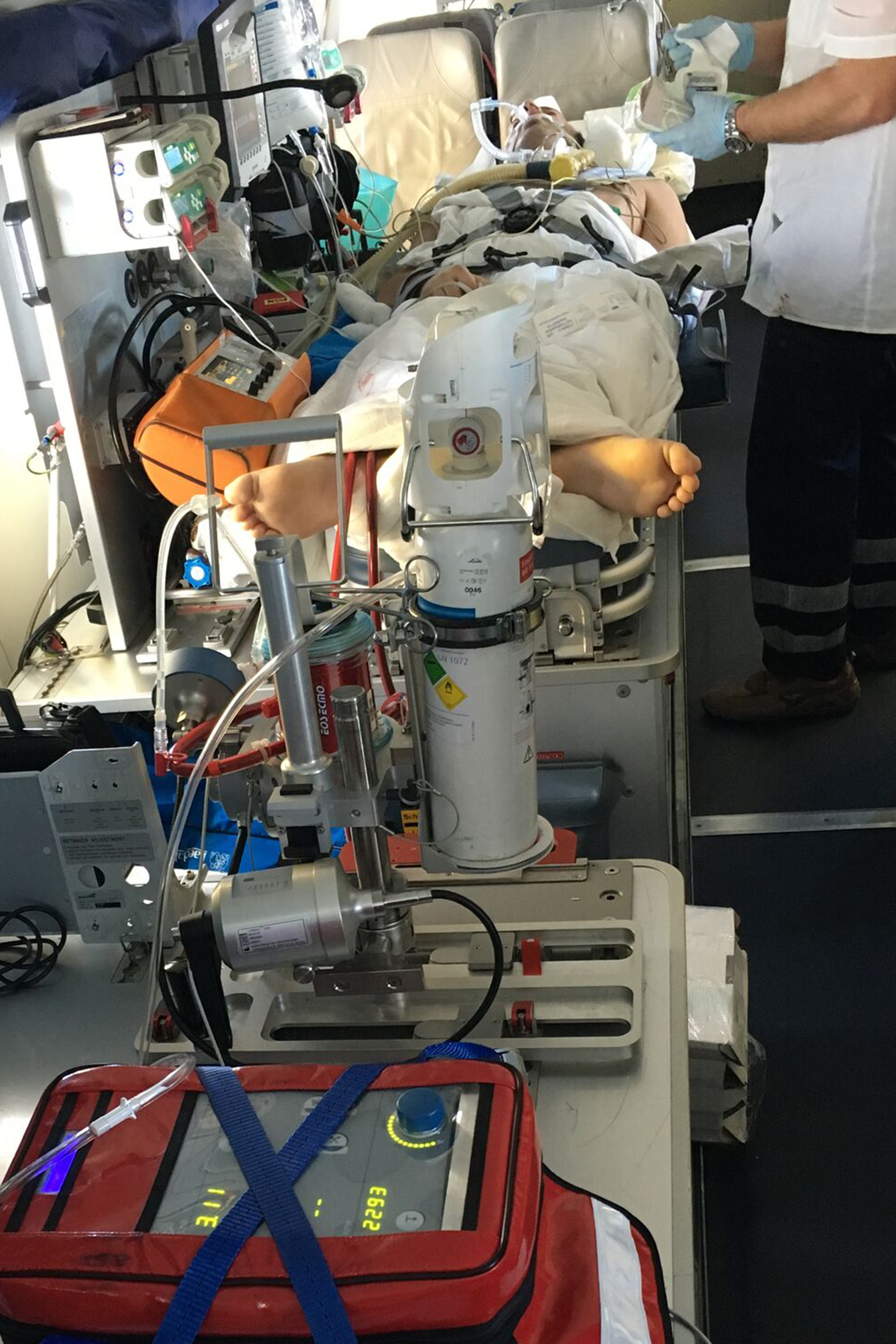 Binnen zwölf Stunden saßen zwei Erlanger Experten im Flugzeug nach Cancún: Dr. René Tandler, Oberarzt der Herzchirurgischen Klinik, und der Kardiotechniker Steffen Oehrlein (WKK Perfusionsservice GmbH & Co. KG) – im Gepäck eine mobile Herz-Lungen-Maschine. „Teile des Materials gelten auf Flughäfen als Gefahrengut, beispielsweise die Sauerstoffflasche“, erklärt Steffen Oehrlein. „Unsere Erfahrung, kooperatives Bordpersonal und die teilweise Deklarierung als Handgepäck machten es möglich, dass wir den Linienflug trotzdem nehmen konnten.“