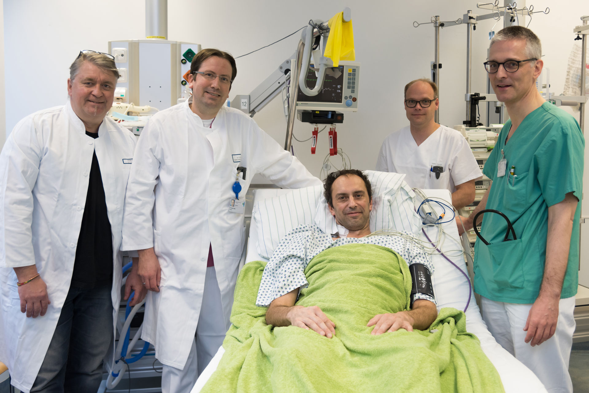 Dort warteten bereits PD Dr. Richard Strauß und sein Team: Alle waren gut auf den Fall vorbereitet, stand PD Strauß doch schon von Anfang an in engem Kontakt mit Dr. Meyer. „Zum einen schlossen wir den Patienten möglichst schnell an unsere eigenen ECMO-Geräte an, um die mobile Herz-Lungen-Maschine für den nächsten Einsatz freizumachen“, erklärt der stellvertretende Klinikdirektor und Leiter des Schwerpunkts Intensivmedizin und Klinische Infektiologie. „Zum anderen galt es, ein Rätsel zu lösen: Vor uns lag ein Mensch mit Multiorganversagen, der sich im künstlichen Koma befand, dessen Krankheitsursache unklar war und dessen bisherige Therapie wir nicht im Detail kannten.“ Die Intensivmediziner und Fachkrankenpfleger gingen schrittweise vor, ließen Andreas M. langsam erwachen und konnten nach und nach die unterschiedlichen Ersatzverfahren sowie die Beatmung beenden. Ein Erreger ließ sich allerdings nicht ausmachen, die Ärzte vermuten, dass sich der Urlauber eine schwere Infektion zugezogen hat, die eskalierte. „Inzwischen sind aber alle Körperfunktionen weitestgehend wiederhergestellt“, sagt PD Strauß. „Wir können den Patienten jetzt in eine Rehabilitationseinrichtung verlegen und ich gehe fest davon aus, dass er in ein paar Wochen wieder auf den Beinen ist und keine bleibenden Schäden davonträgt.“