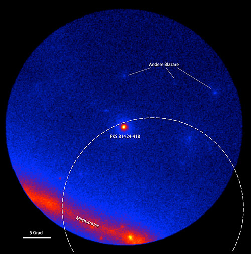 Im Sommer 2012 wurde das Gammastrahlen-Observatorium Fermi der NASA Zeuge eines dramatischen Aufleuchtens im Zentralgebiet der aktiven Galaxie PKS B1424-418, die als Gammastrahlungs-Blazar klassifiziert ist. Eine aktive Galaxie ist eine im Prinzip normale Galaxie, die allerdings einen ungewöhnlich hellen kompakten Kernbereich aufweist. Die starke Strahlung im Zentralbereich wird durch den Einfall von Materie in ein supermassereiches Schwarzes Loch im Zentrum der Galaxie erzeugt, mit Millionen oder sogar Milliarden mal der Masse unserer Sonne.