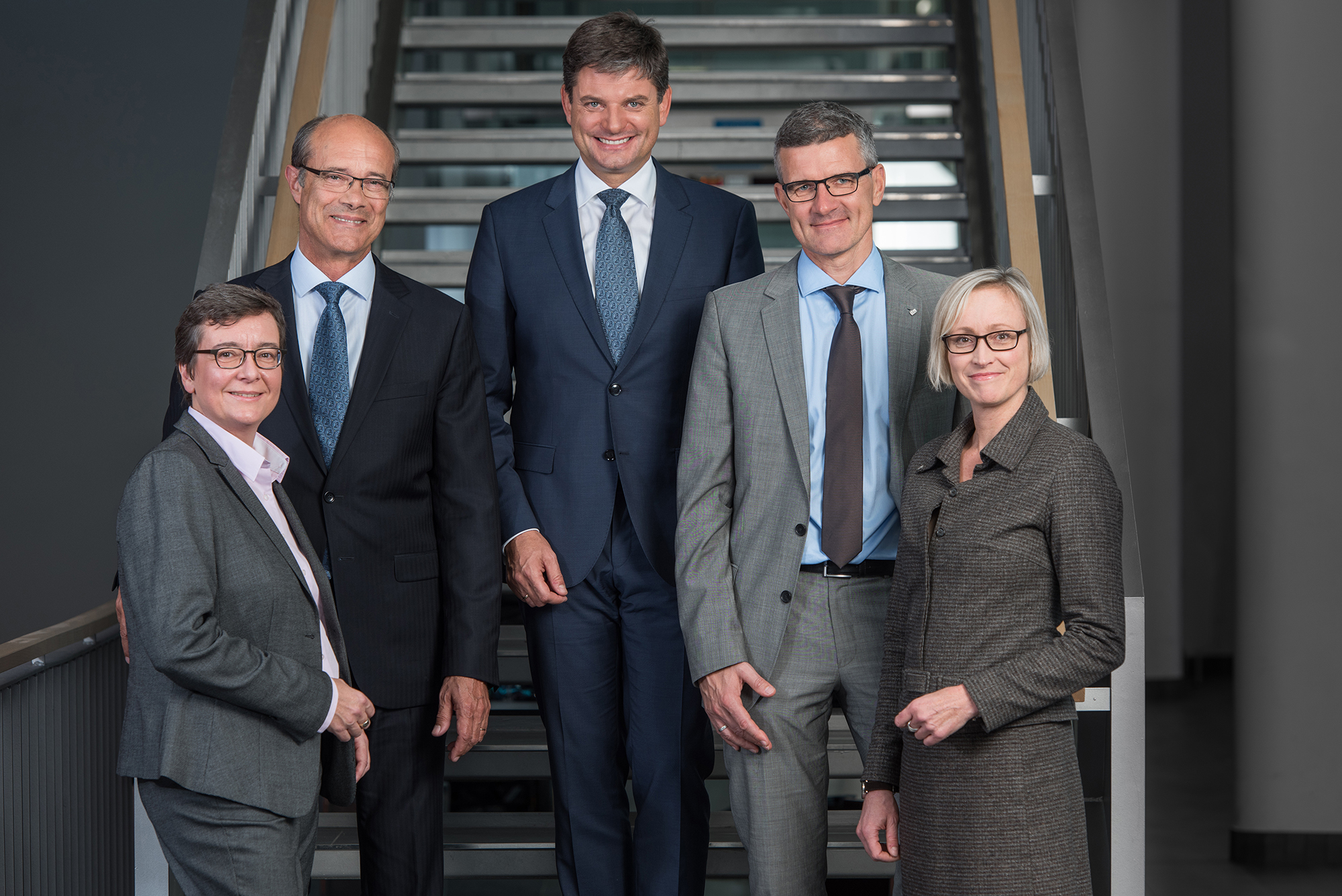 - FAU-Präsident mit Vizepräsidentinnen und Vizepräsidenten (Bild: FAU/Thomas Einberger) Von links nach rechts: Prof. Dr. Kathrin M. Möslein, Vizepräsidentin für Forschung, Prof. Dr. Günter Leugering, Vizepräsident für Internationale Angelegenheiten, Prof. Dr. Joachim Hornegger, Präsident der FAU, Prof. Dr. Friedrich Paulsen, Vizepräsident für Lehre, sowie Prof. Dr. Antje Kley, Vizepräsidentin für Lehrerinnen- und Lehrerbildung sowie Chancengleichheit.