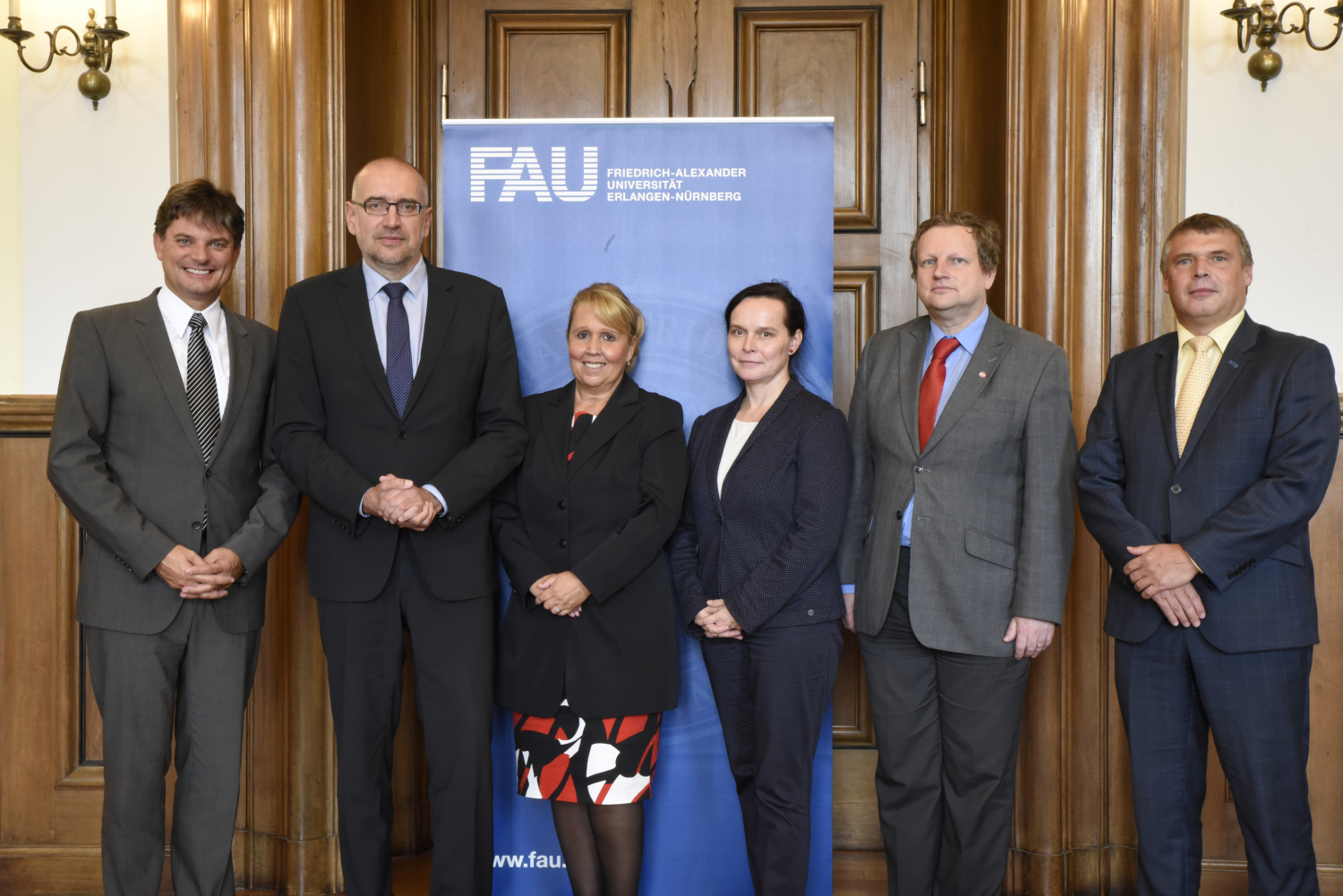Vertreter der tschechischen Hochschulrektorenkonferenz besuchten die Friedrich-Alexander-Universität Erlangen-Nürnberg. Der Präsident der FAU, Prof. Dr. Joachim Hornegger, empfing die Delegation in seinem Amtszimmer. Hintergrund ist die erste Reise der tschechischen Hochschulrektorenkonferenz nach Bayern, die dem Kennenlernen und Informationsaustausch mit den dortigen Universitäten dient. Die Bayerische Hochschulagentur für Mittel-, Ost- und Südosteuropa (BayHOST) hat die Reise organisiert.