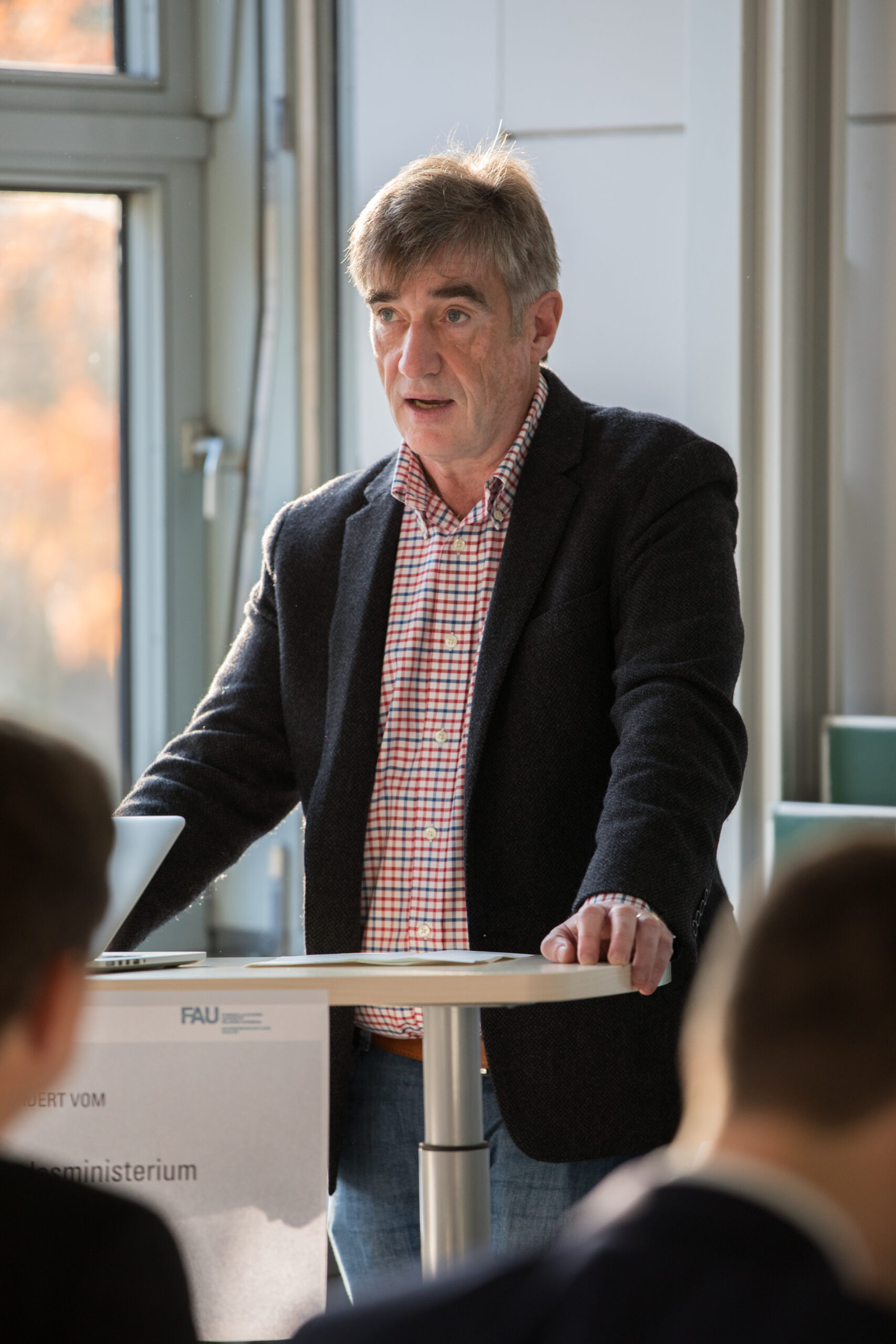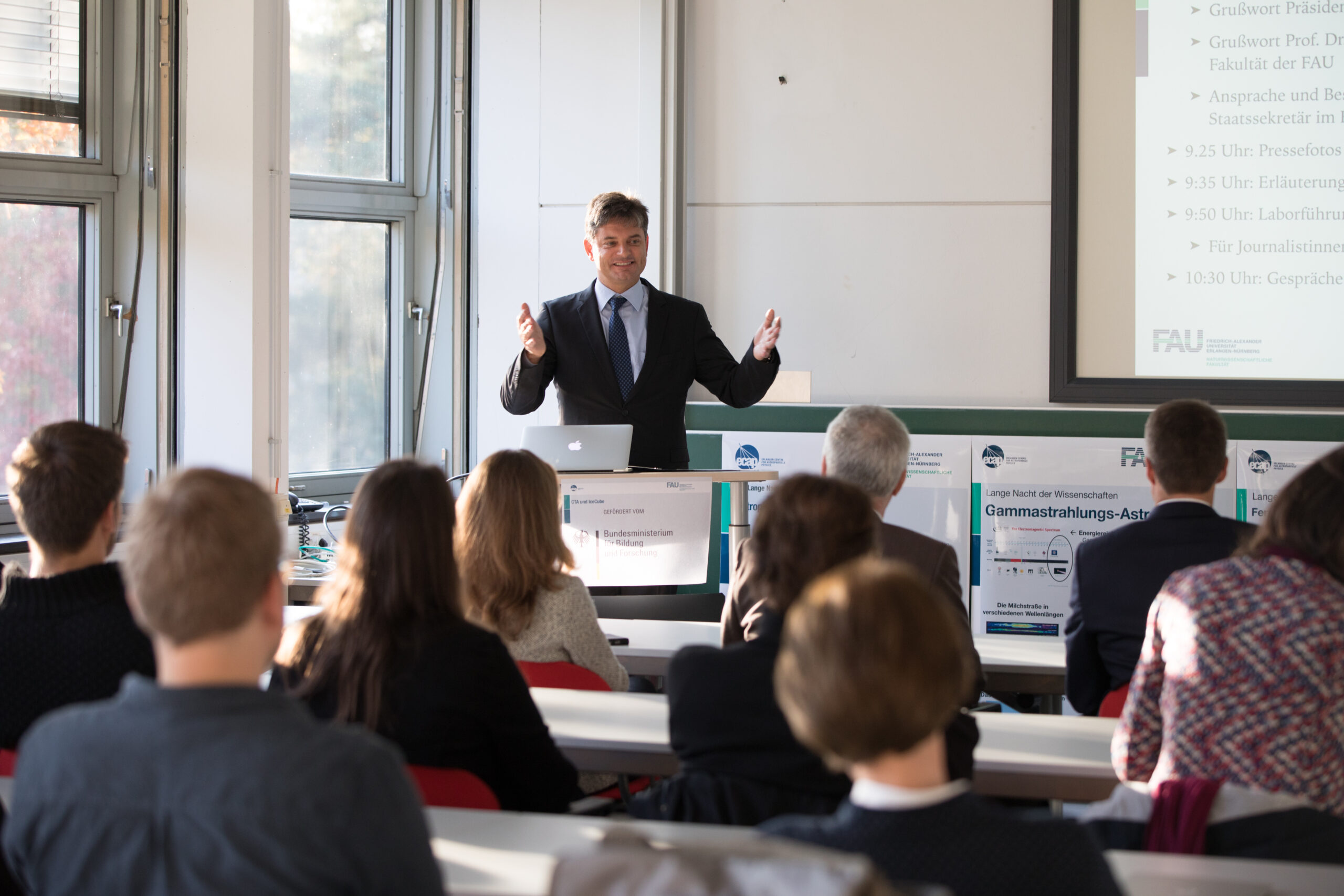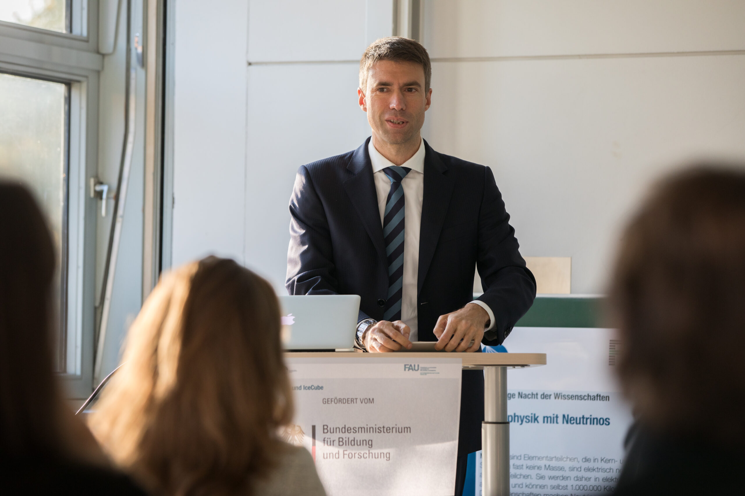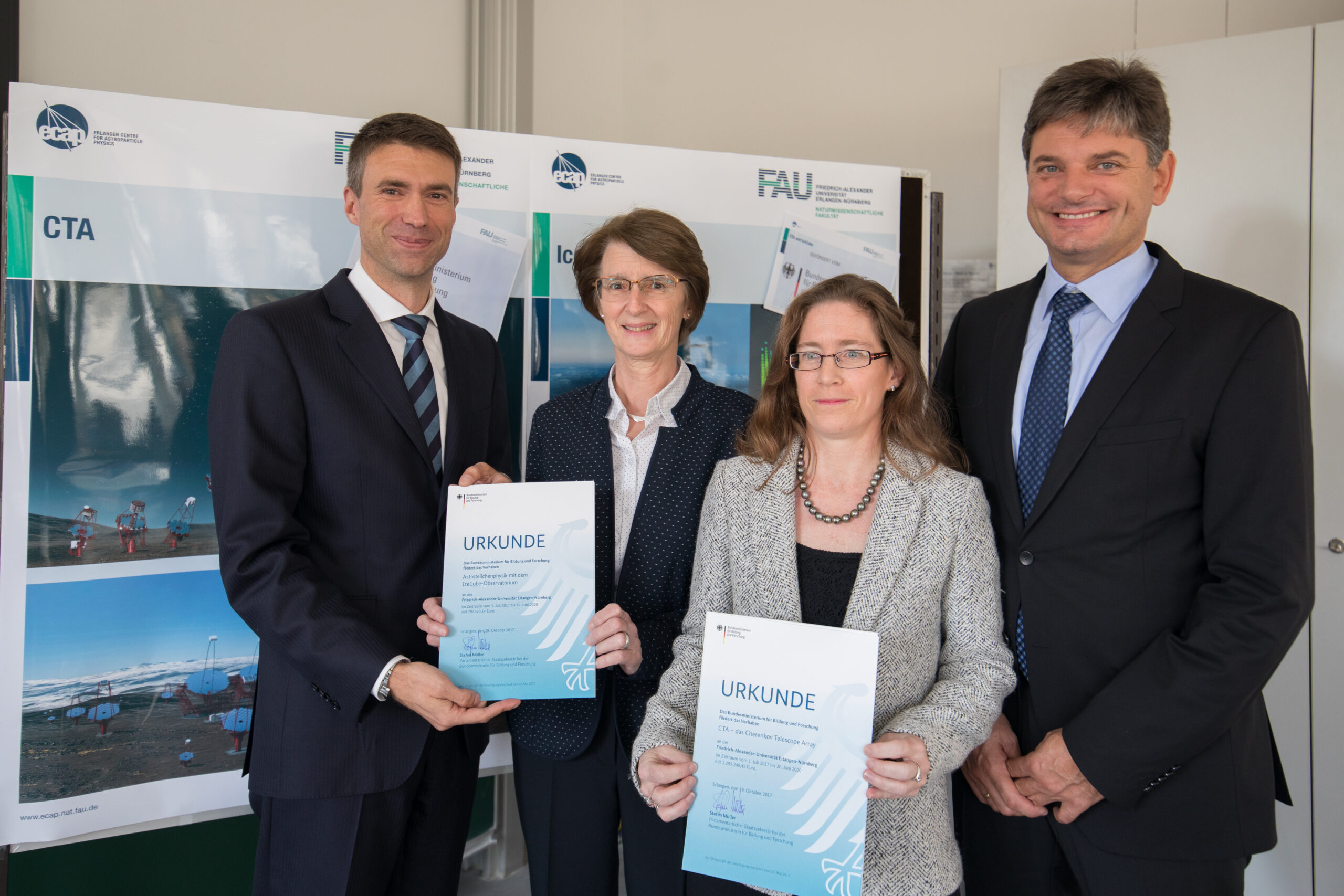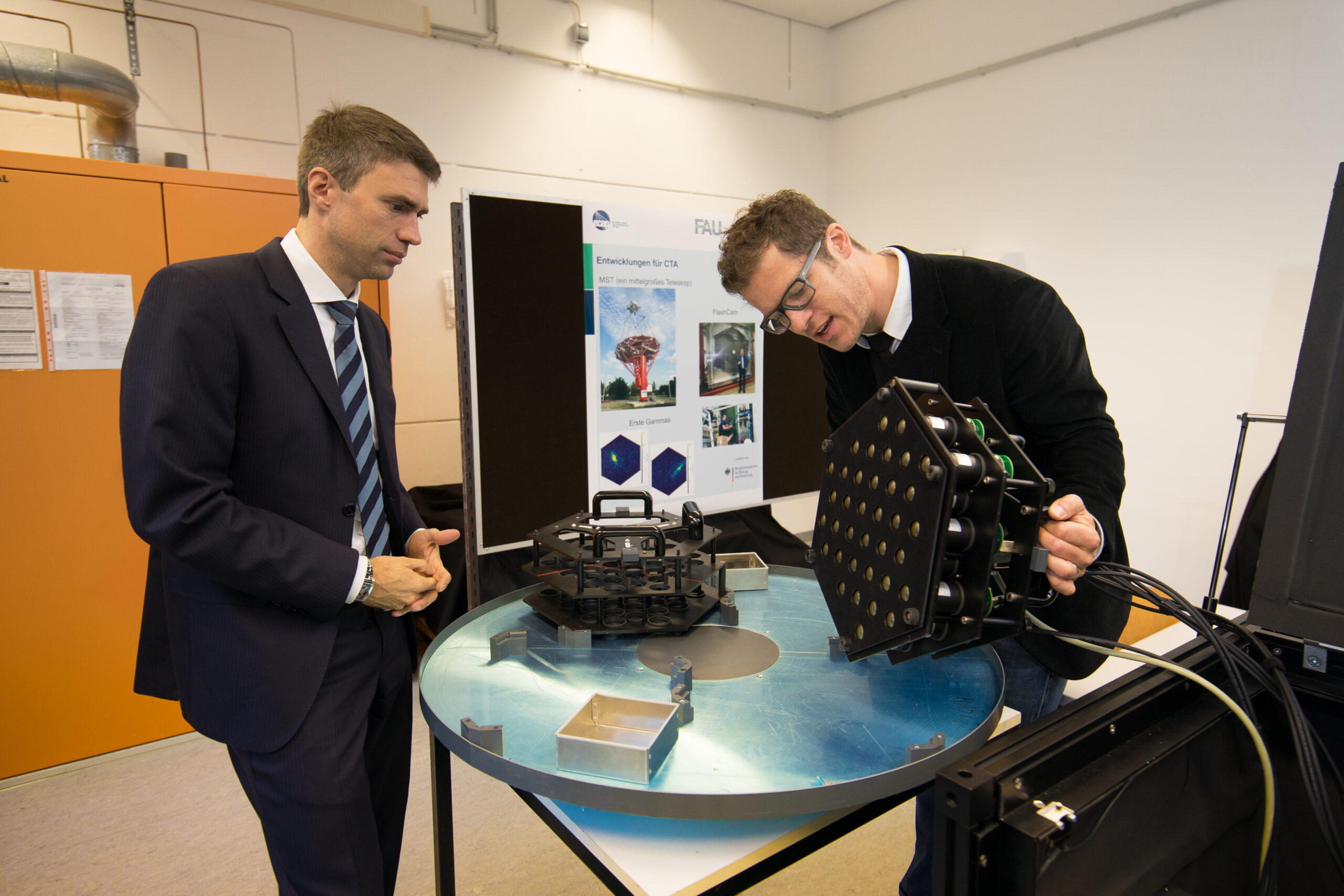 Wie schon 2014 überreichte Stefan Müller, Parlamentarischer Staatssekretär beim BMBF, die Zuwendungsbescheide den ECAP-Wissenschaftlern und nutzte die Gelegenheit, sich über neue Entwicklungen und aktuelle Forschungsaktivitäten am ECAP zu informieren. „Mit unserem Rahmenprogramm ‚Erforschung von Universum und Materie‘ (ErUM) schaffen wir die Bedingungen für Spitzenforschung made in Germany und fördern Grundlagenforschung für Technologien am Rande des Machbaren. Das ECAP ist hierfür ein leuchtendes Beispiel“, betonte Staatssekretär Müller. „Die exzellenten Erfolge in der Astroteilchen- und Astrophysik gehen einher mit beispielhaftem Technologietransfer, etwa von der Detektorentwicklung zu Anwendungen in der medizinischen Bildgebung oder Dosimetrie. Das ECAP stärkt damit die internationale Sichtbarkeit und Wettbewerbsfähigkeit unseres Bildungs- und Wissenschaftsstandortes – ganz im Sinne des Rahmenprogramms.“