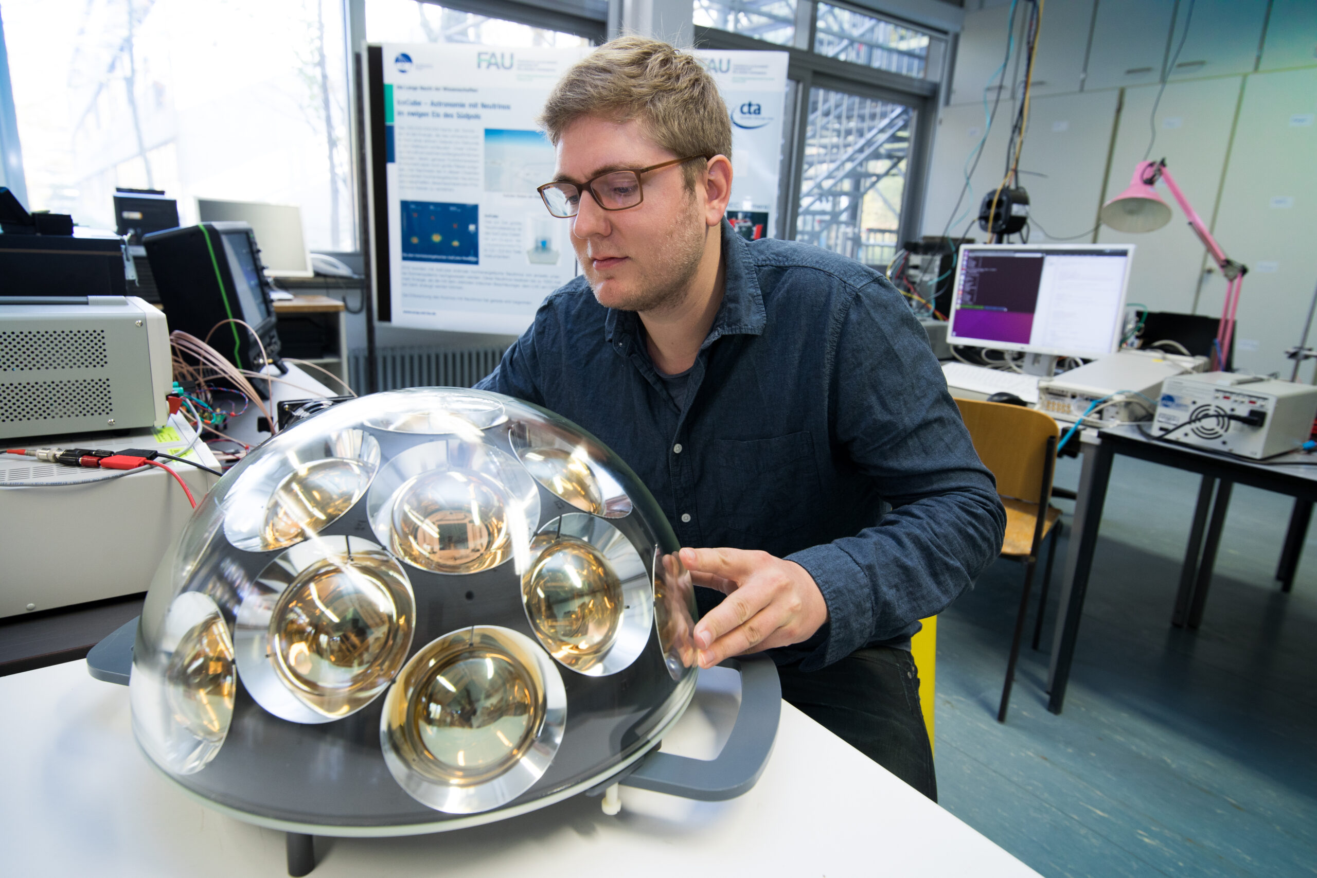 10/10Das ECAP, ein Zusammenschluss von fast 200 Wissenschaftlerinnen und Wissenschaftlern aus der Astrophysik, der Astroteilchenphysik und der Theoretischen Physik, erforscht hochenergetische Teilchen aus dem Universum, insbesondere Gammaquanten und Neutrinos. „Dies sind die perfekten Botschafter des Universums, weil wir mit ihrer Hilfe den Ursprung der kosmischen Strahlung und die Funktionsweise der kosmischen Teilchenbeschleuniger erforschen können“, erklärt ECAP-Direktor Prof. Dr. Stefan Funk. „Besondere Bedeutung hat unsere Forschung auch im Zusammenhang mit den kürzlich entdeckten Gravitationswellen, da die gleichzeitige Beobachtung unterschiedlicher Botenteilchen wissenschaftlich extrem interessant ist. Die Projektförderung des BMBF ist das zentrale Instrument, mit dem Universitäten in die Lage versetzt werden, internationale Spitzenforschung an Großgeräten zu betreiben.“ Für die internationalen Großprojekte der Neutrino- und Gammaastronomie entwickelt und baut das ECAP unter anderem Kameras, Sensorsysteme und Detektoren. Darüber hinaus sind Erlanger Astroteilchenphysiker in den Betrieb der Teleskope und in die Datenauswertung eingebunden und entwickeln neue Softwarepakete und Analysemethoden.