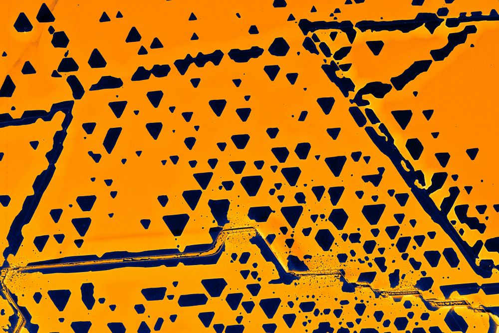 In der Mikroskopaufnahme sind die charakteristischen Dreiecke zu sehen, die das Gold bei beginnender Entnetzung ausbildet, weil es der Kristallografie des Trägermaterials folgt. Durch eine kontrollierte Erhöhung der Temperatur können die Forscher um Prof. Dr. Erdmann Spiecker die Löcher so weit vergrößern, dass letztlich ein dünnes Netz aus Goldbahnen entsteht. Dieser Prozess des „Templated dewetting“ könnte künftig genutzt werden, um Metallnetze herzustellen, die elektrisch leitfähig und dennoch lichtdurchlässig sind. Solche transparenten Stromleiter sind beispielsweise für die Fotovoltaik interessant, weil sie dazu beitragen können, die nutzbare Lichtabsorbtionsfläche von Solarmodulen zu vergrößern und damit ihre Effizienz zu erhöhen.
