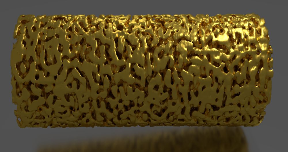 Dieser zylindrische Goldschwamm hat einen Durchmesser von wenigen Mikrometern. Um das poröse Netzwerk herzustellen, wird eine Legierung aus Gold und Silber zunächst mit Salpetersäure behandelt, wodurch sich die Silberatome selektiv lösen. Die Größe der Verbindungsstege der Struktur, in der Fachsprache „Ligamente“ genannt, kann über eine anschließende Wärmebehandlung gezielt eingestellt werden und beträgt im gezeigten Beispiel etwa 300 Nanometer. Die Abbildung ist das Ergebnis einer 3D-Analyse mittels hoch aufgelöster Röntgentomografie: Die Probe wird dabei von allen Seiten durchstrahlt – ähnlich wie bei einer CT-Aufnahme in der Medizin. Über spezielle Rekonstruktions-Algorithmen und anschließendes Rendering wird aus den zweidimensionalen Tomografiedaten dann das dreidimensionale Bild gewonnen.