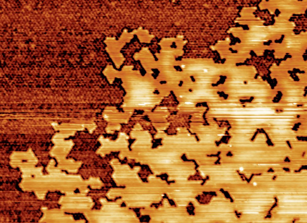 Dieses Bild zeigt ein zweidimensionales Kohlenstoffgitter. Die sternförmigen, etwa drei Nanometer großen Ringe bestehen jeweils aus sechs dreieckigen Molekülen, die sich wiederum aus 21 Kohlenstoff- und drei Sauerstoffatomen sowie einem Stickstoffatom zusammensetzen. Die Struktur ist das Ergebnis eines mehrstufigen Verknüpfungsprozesses: Kohlenstoffmoleküle werden in einer Vakuumkammer verdampft und setzen sich auf einem Goldfilm ab, der als Katalysator dient. Beim Erhitzen auf etwa 280 Grad Celsius verbinden sich die Moleküle eigenständig – zunächst zu eindimensionalen Ketten, in einem zweiten Schritt zu einem zweidimensionalen Netzwerk.