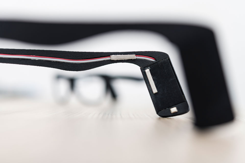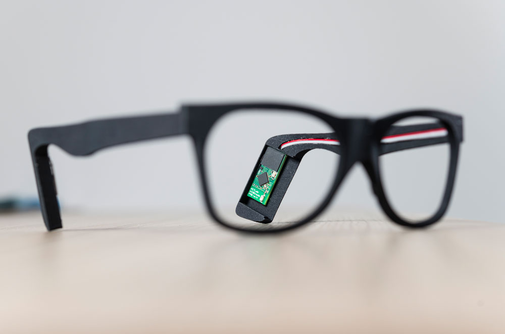 Zum Massenprodukt wird die Brille in absehbarer Zeit nicht – im Gegenteil: Die Gestelle werden auf die Anatomie der jeweiligen Person zugeschnitten. Dafür wird beispielsweise der Kopf mit einem Scanner vermessen, damit die Sensoren später perfekt an der Haut und am anatomisch richtigen Ort liegen. Auch die Zahl der Sensoren wird an den jeweiligen Anwendungsfall angepasst, quasi als persönliches Markerset. Damit jedes dieser Einzelstücke wirtschaftlich hergestellt werden kann, bedienen sich Amft und sein Team neuartiger Fertigungsmethoden: Statt per klassischem Spritzguss werden die Brillen im 3D-Druck produziert.
