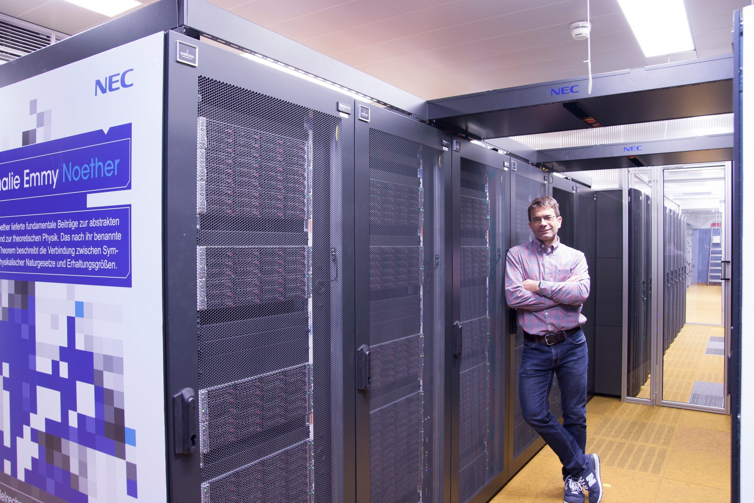 Solche Hochleistungsrechner sind nicht aufgebaut wie die Computer, die in unseren Haushalten oder an unseren Arbeitsplätzen stehen: „Man muss einen normalen PC hernehmen und eigentlich fast alle Komponenten bis auf die Prozessorkerne und den Speicher wegnehmen. Diese setzt man dicht gepackt in einen Schrank und dann ganz viele dieser Schränke nebeneinander. Das ist ein Hochleistungscomputer“, erklärt Prof. Dr. Gerhard Wellein, Professur für Höchstleistungsrechnen. Viele solcher Schränke stehen im Serverraum des Regionalen Rechenzentrums Erlangen (RRZE). Ihr eher unspektakuläres Aussehen verrät dem Beobachter nicht, was sich Großes in ihnen versteckt – dass in ihrem Innern gerade Eiweiße, Partikelstürme, Strömungsfelder oder Klimaveränderungen simuliert werden.