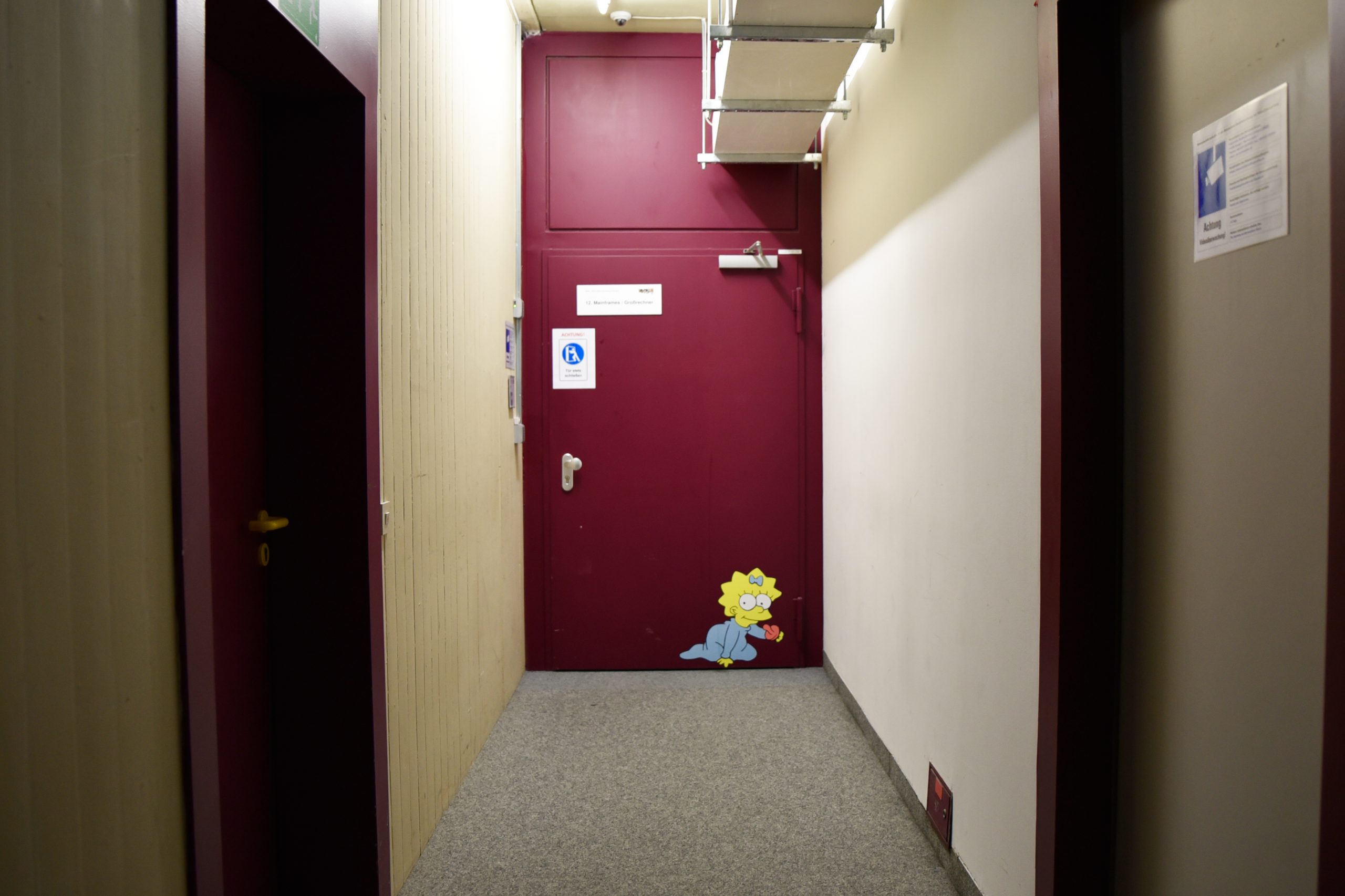 Am Ende des Gangs befindet sich eine weinrote Tür. Unten in der Ecke ist Maggie von den Simpsons zu sehen – ein Hinweis darauf, was sich dahinter befindet? Beim Öffnen der Tür erklingt ein Brummen. Große Schränke kommen zum Vorschein, in denen sich viele Kabel verstecken, durch die feinvergitterten Schranktüren sind kleine Lichter zu sehen. Wir befinden uns im Reich der Hochleistungsrechner der FAU.