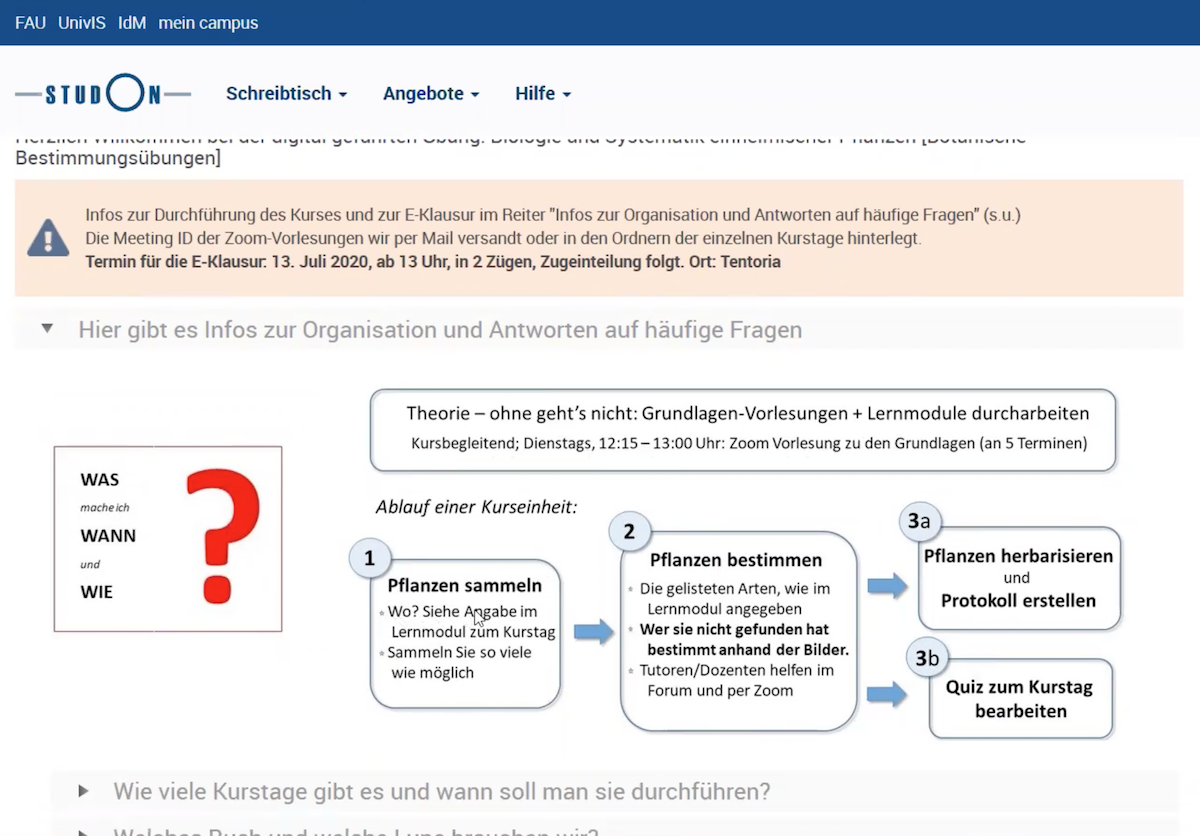 Bei ganz kurzfristigen Umsetzungen gibt es immer das Problem, dass man Dinge anbietet, die fehlerbehaftet sind. Dagegen haben wir uns für die Digitalisierung der kursbegleitenden Online-Angebote zu den Bestimmungsübungen viele Jahre Zeit genommen und Hilfskräfte finanziert. Die haben sich über StudOn ausbilden lassen und unter unserer Anleitung die Online-Kurse erstellt. Wir haben diese dann kontrolliert und verbessert. Was wir für das Sommersemester gemacht haben, ist dagegen etwas einfacher strukturiert. Das könnten wir eigentlich viel schöner.