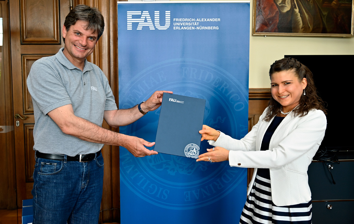 „Wir bieten jungen Wissenschaftlerinnen und Wissenschaftlern mit der FAU-Nachwuchsgruppenleitung eine ausgezeichnete Entwicklungschance: Sie bekommen weitere Verantwortung übertragen und können früh in ihrer Karriere wissenschaftliche Eigenständigkeit und Sichtbarkeit erlangen. Diese Art der Förderung ist mir ein persönliches Anliegen“, erklärt Prof. Dr. Joachim Hornegger anlässlich der Urkundenübergabe.