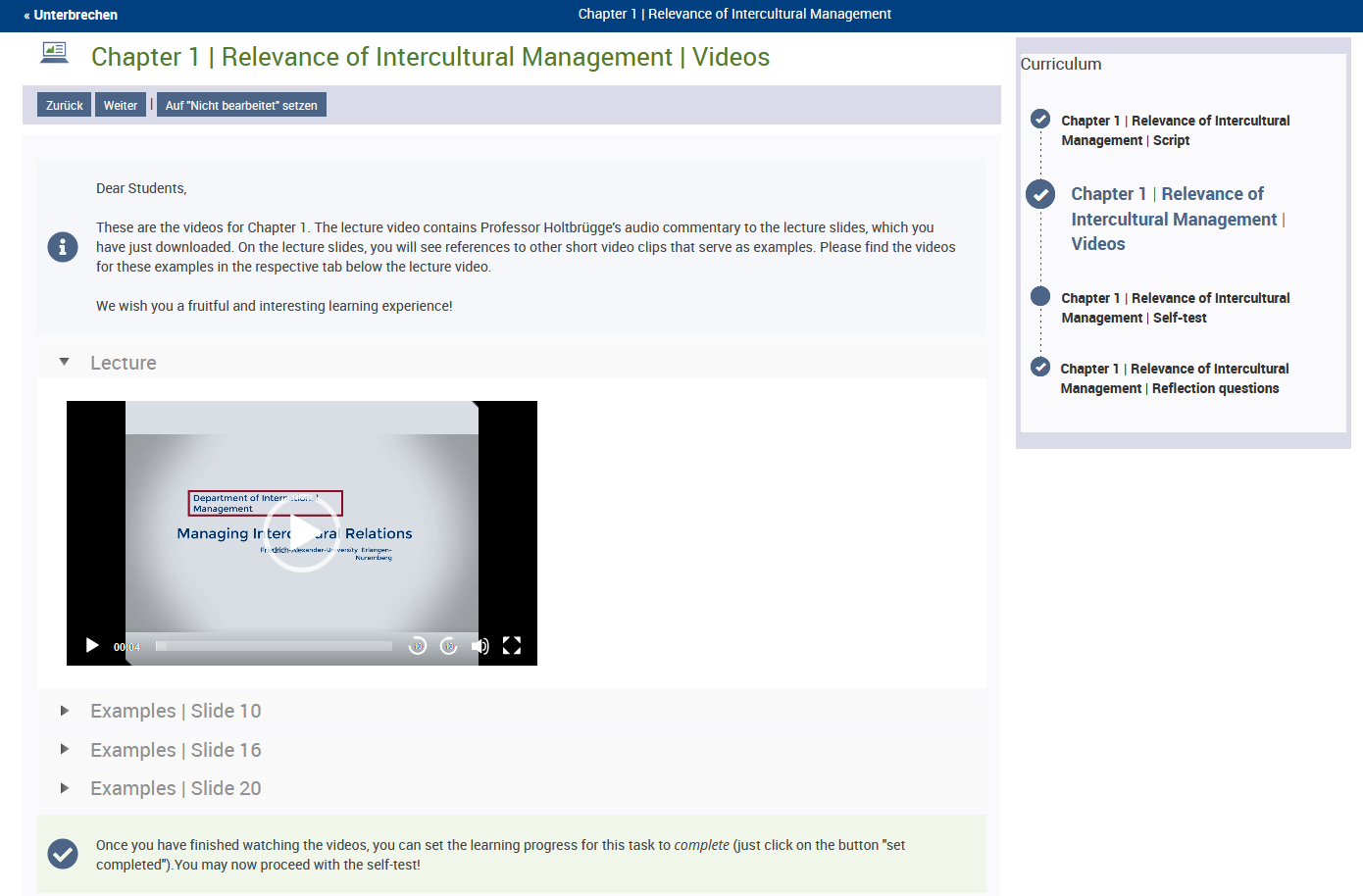 - Beispiel einer Lerneinheit zur Lehrveranstaltung „International Marketing“ von Prof. Holtbrügge und Laura Kirste im Rahmen der Virtuellen Hochschule Bayern.