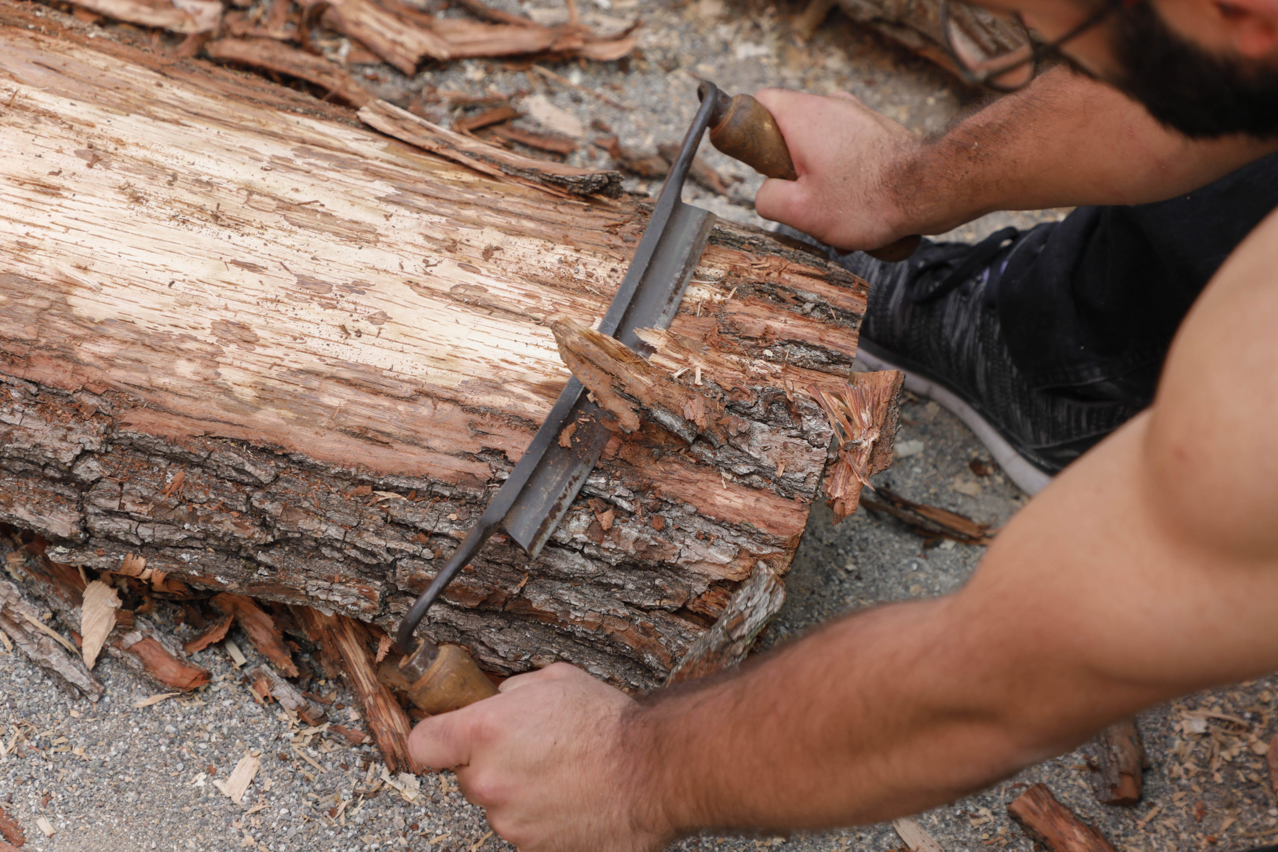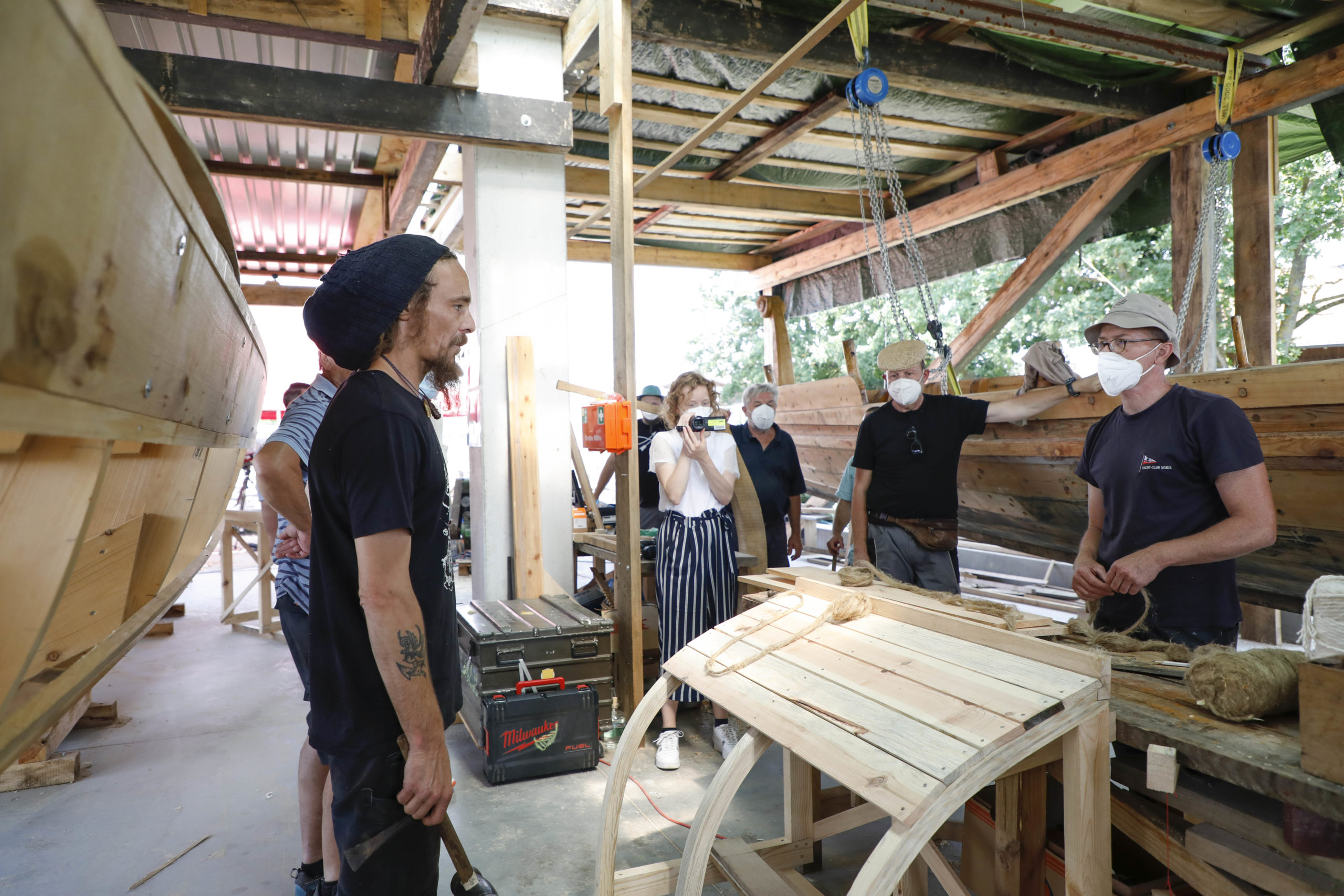 Jetzt dürfen die Teilnehmer an den Amboss, aber nicht, um die restlichen 3999 Nägel für die DUC zu schmieden. Ihren selbst geschmiedeten Nagel dürfen die Teilnehmerinnen und Teilnehmer als Andenken mit nach Hause nehmen. „Wir können natürlich nicht alle Materialien komplett so herstellen, wie es die Römer getan haben. Die Nägel alle vom Schmied anfertigen zu lassen, wäre viel zu teuer und würde zu lange dauern“, erklärt Prof. Dreyer. Ähnlich sei es beim Fällen und Sägen der 18 Eichen für die D.V.C. gewesen. Mit einer Axt haben die Bootsbauer den ersten Baum gefällt, mit einer Dechsel entrindet und mit einer Kastensäge Planken herausgesägt. Jeder Schritt wird exemplarisch in traditioneller Arbeitsweise ausprobiert, für die restliche Arbeit benutzt das Team moderne Werkzeuge. Diese halfen auch, die durch Corona verlorene Arbeitszeit, wieder aufzuholen. Schließlich hat Dreyer mit der D.V.C. im nächsten Jahr noch einiges vor. Bis dahin müssen die Planken abgeschliffen und Makel im Holz ausgebessert werden, bevor es an die Bemalung geht.