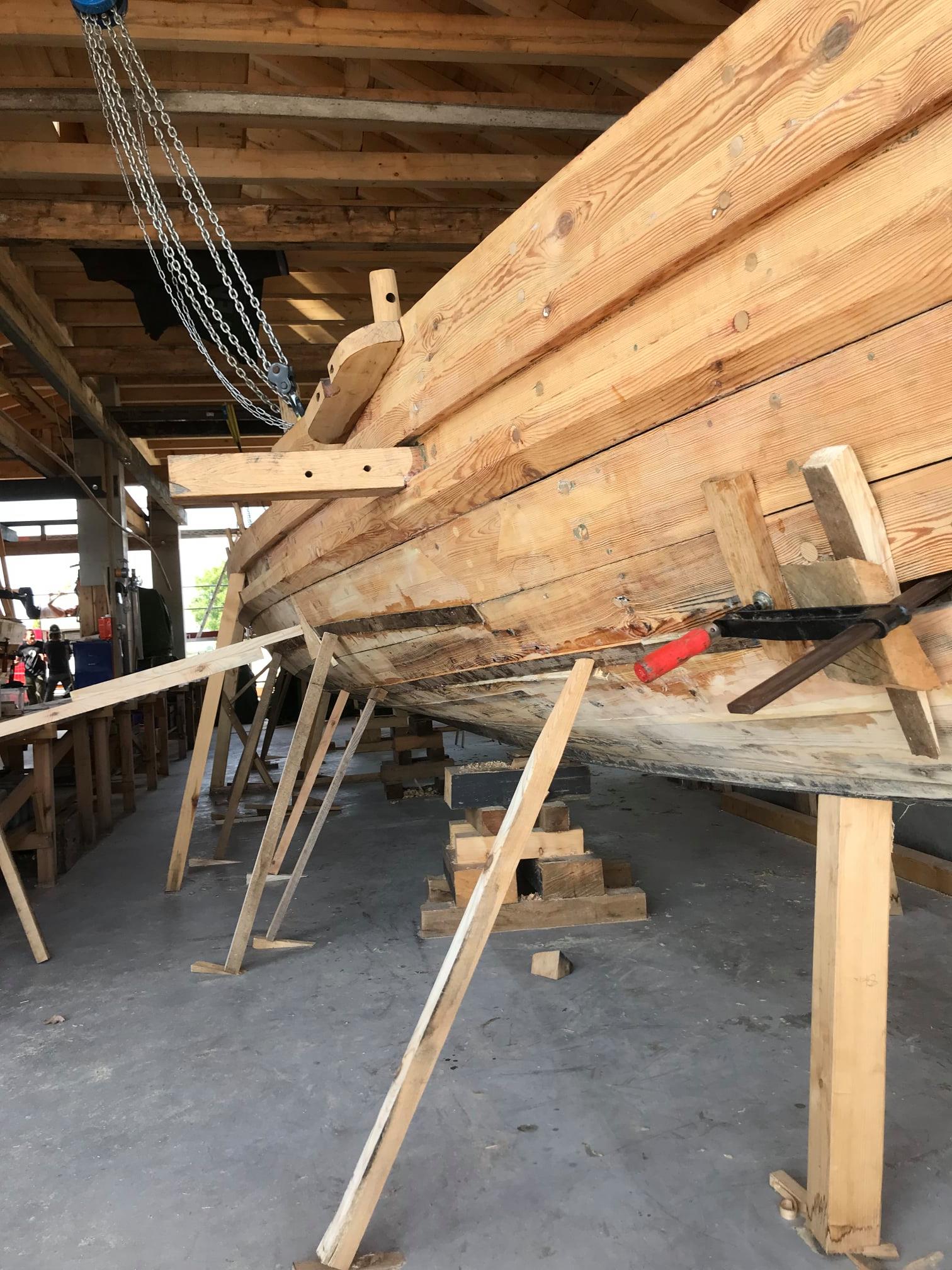 Um zu sehen, wie schlimm das Holz befallen ist, haben die Bootsbauerinnen und Bootsbauer die Farbe und den Lack der F.A.N. mit Trockeneis abgestrahlt. Die aufgemalten Augen am Bug schimmerten zuletzt nur noch leicht auf dem Holz. Die restliche grüne, blaue und rote Bemalung war verschwunden. Der freie Blick auf das Holz zeigte nichts Gutes. Überall am Schiff waren Planken befallen und zwar so stark, dass nur noch Austauschen möglich war. Ende Juli war dies auf der Backbordseite schon geschehen. Bis Anfang September tauschten die Bootsbauer gemeinsam mit den Studierenden und freiwilligen Helferinnen und Helfern auch die Steuerbordseite aus, schliffen die neuen Planken ab. Nun folgt das Kalfatern, also das Abdichten der Ritzen zwischen den Planken mit Hanfseilen. Dann kommt die F.A.N. wieder ins Wasser „Ein Holzboot gehört ins Wasser, an Land verzieht sich das Holz nur wieder“, sagt Prof. Dreyer.
