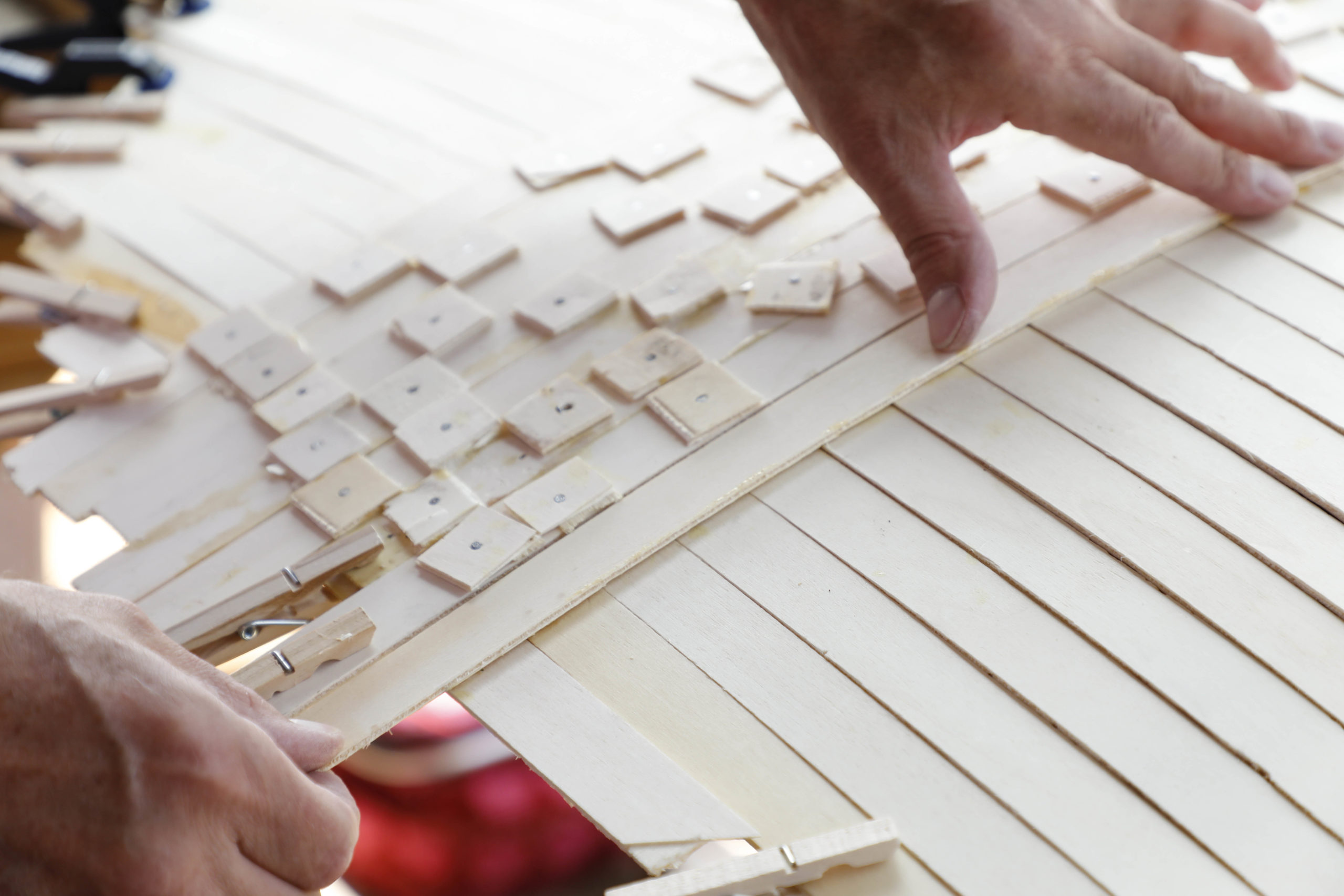 „Die Römer haben die Schilde beim Kampf mehrere Stunden am Körper getragen, deshalb mussten sie auch besonders leicht sein“, erklärt Boris Dreyer. Neben Schilden aus Vollholz gab es deshalb auch leichtere aus Sperrholz. Die FAU-Historikerinnen und -Historiker verwenden bei ihrem Nachbau zwei Zentimeter breite und drei Millimeter dicke Streifen aus Pappel. Die einzelnen Streifen werden auf einer ovalen, 120 Zentimeter langen und 90 Zentimeter breiten Form aus Holz befestigt. Dann wird eine weitere Schicht Holzstreifen im rechten Winkel zur ersten aufgetragen und mit Leim nach antiker Rezeptur fixiert. Die dünnen Holzstreifen lassen sich gut in eine nach außen abgerundete Form biegen, die das Schild stabiler macht. Vorbilder für diese Bauweise sind Funde aus dem ägyptischen Fayum und Dura Europos im heutigen Syrien, auch wenn diese sich in ihrer Form – halbrunde Turmschilde, sogenannte Scuta, die an eine mittig geteilte Tonne erinnern – von den großen Ovalschilden unterscheiden, die Prof. Dreyer und sein Team rekonstruieren.