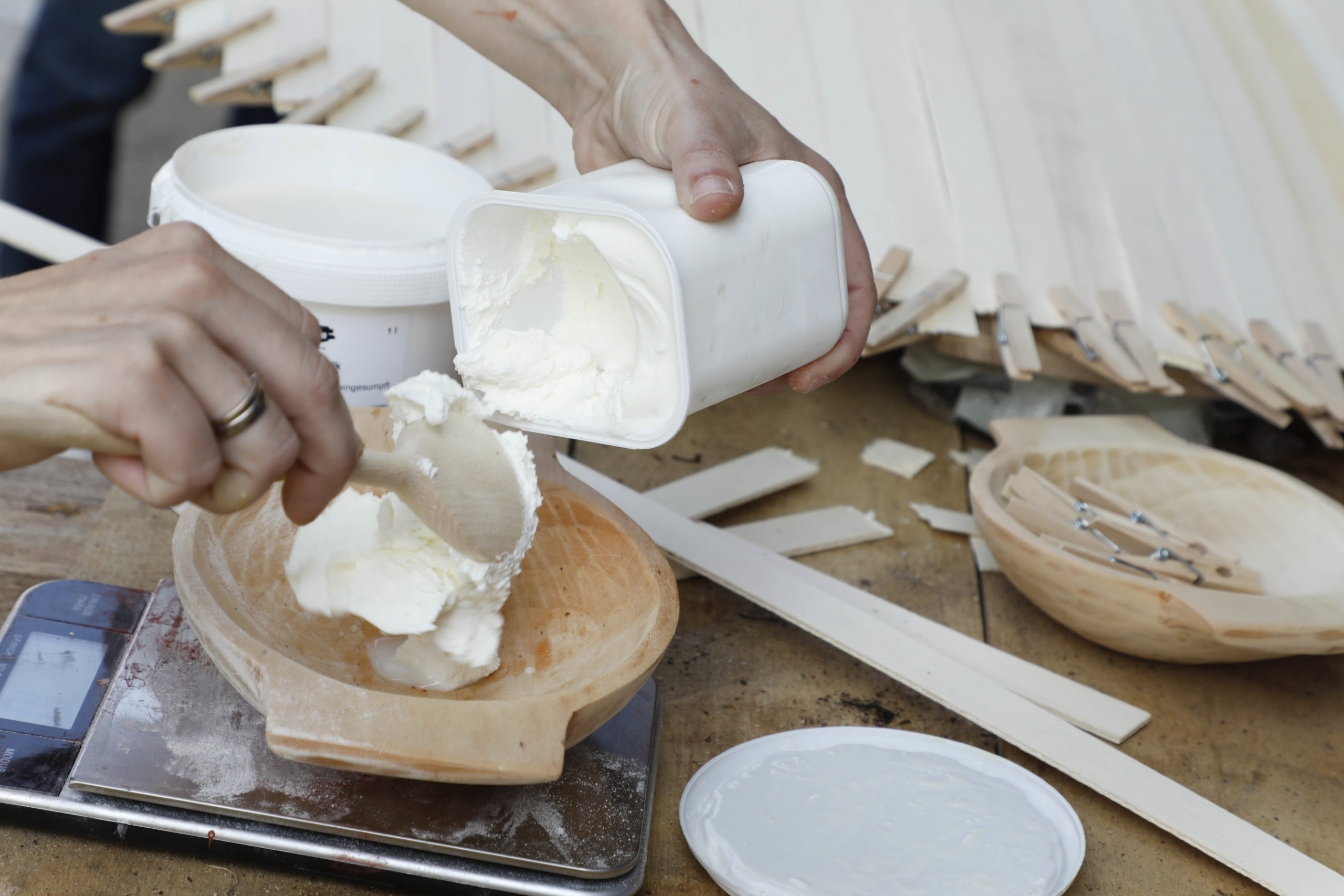 „Wir wussten durch Funde, dass die Schichten mit einer Mischung aus Kasein und Sumpfkalk verleimt waren“. Kasein ist eine Mischung aus Proteinen, die in Milchprodukten vorhanden sind. Besonders viel davon ist in Magerquark. Diesen mischten die Historikerinnen und Historiker mit dem Sumpfkalk. „Bei dem Verhältnis haben wir dann etwas herumprobiert, aber letztendlich klebt das besser als jeder Uhu“, schildert Prof. Dreyer. Über Nacht trocknen die ersten beiden Schichten aus, dann wird eine dritte und letzte Schicht Holzstreifen quer zur vorherigen aufgebracht. Ist auch diese ausgetrocknet, sägt man den Schild in seine ovale Form und in die Mitte ein kleines Loch, das später als Haltegriff dient.