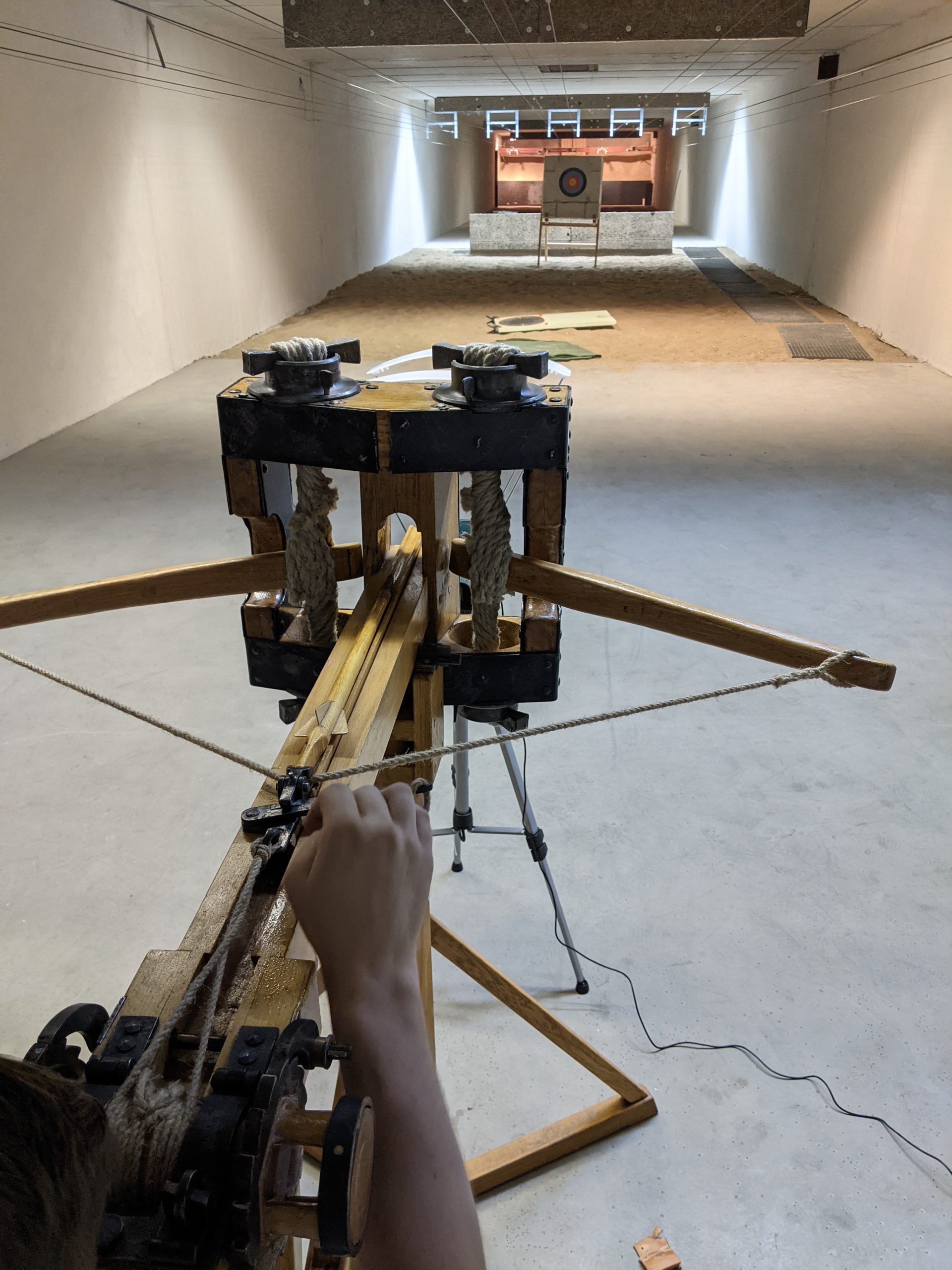 Dann werden Prof. Dreyer und Alexander Hauenstein gemeinsam mit ihrem Team auf der Schießanlage der königlich privilegierten Schützengesellschaft von 1408 Kitzingen die FAS I und die FAS II wieder mit den kurzen Bolzen mit ihren eisernen Spitzen laden, die Geschütze spannen und die Geschosse in die Zielscheiben einschlagen lassen.