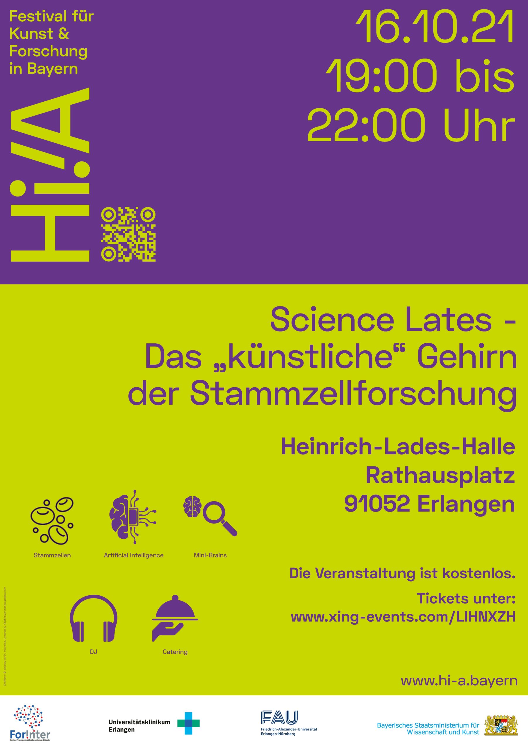 Die Angebote von „Hi!A – Festival für Kunst & Forschung in Bayern“ sind von Mitte Oktober 2021 bis zum Jahresende im gesamten Freistaat zu erleben. Auch das Universitätsklinikum Erlangen und der Forschungsverbund ForInter (Bayerischer Forschungsverbund Interaktion humaner Gehirnzellen) unter der Geschäftsführung der Erlanger Stammzellforscherin Naime Denguir beteiligen sich an der Eventreihe und veranstalten am Samstag, 16. Oktober 2021, einen großen Science Slam samt Podiumsdiskussion in der Heinrich-Lades-Halle. Die Veranstaltung kann auch im Livestream verfolgt werden.