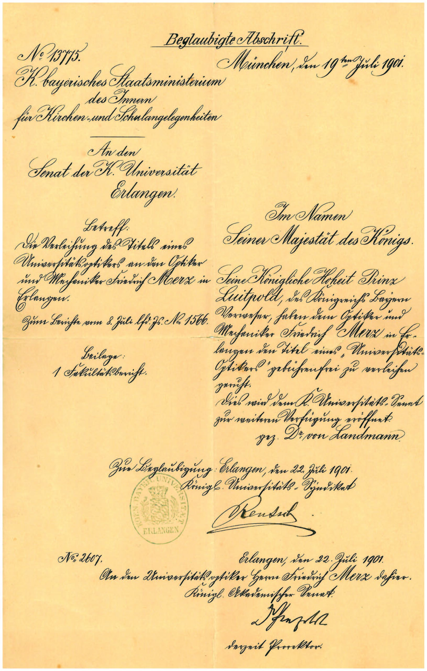 Vor 120 Jahren wurde dem damaligen Erlanger Optiker Friedrich Merz der Titel „Universitätsoptiker“
