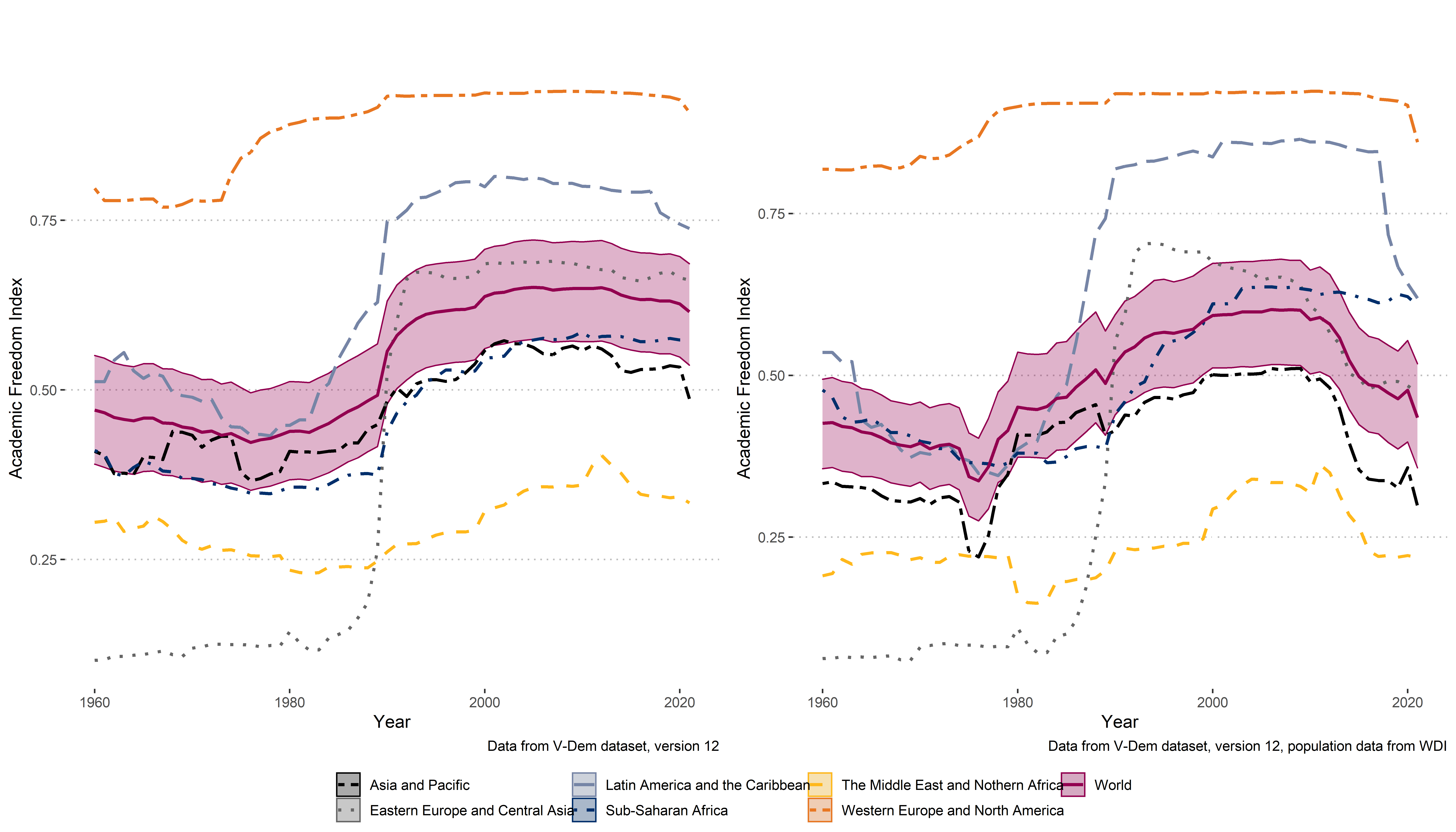 Index der Wissenschaftsfreiheit, globale und regionale Mittelwerte, 1960-2021. (Bild: FAU; V-Dem Institute)