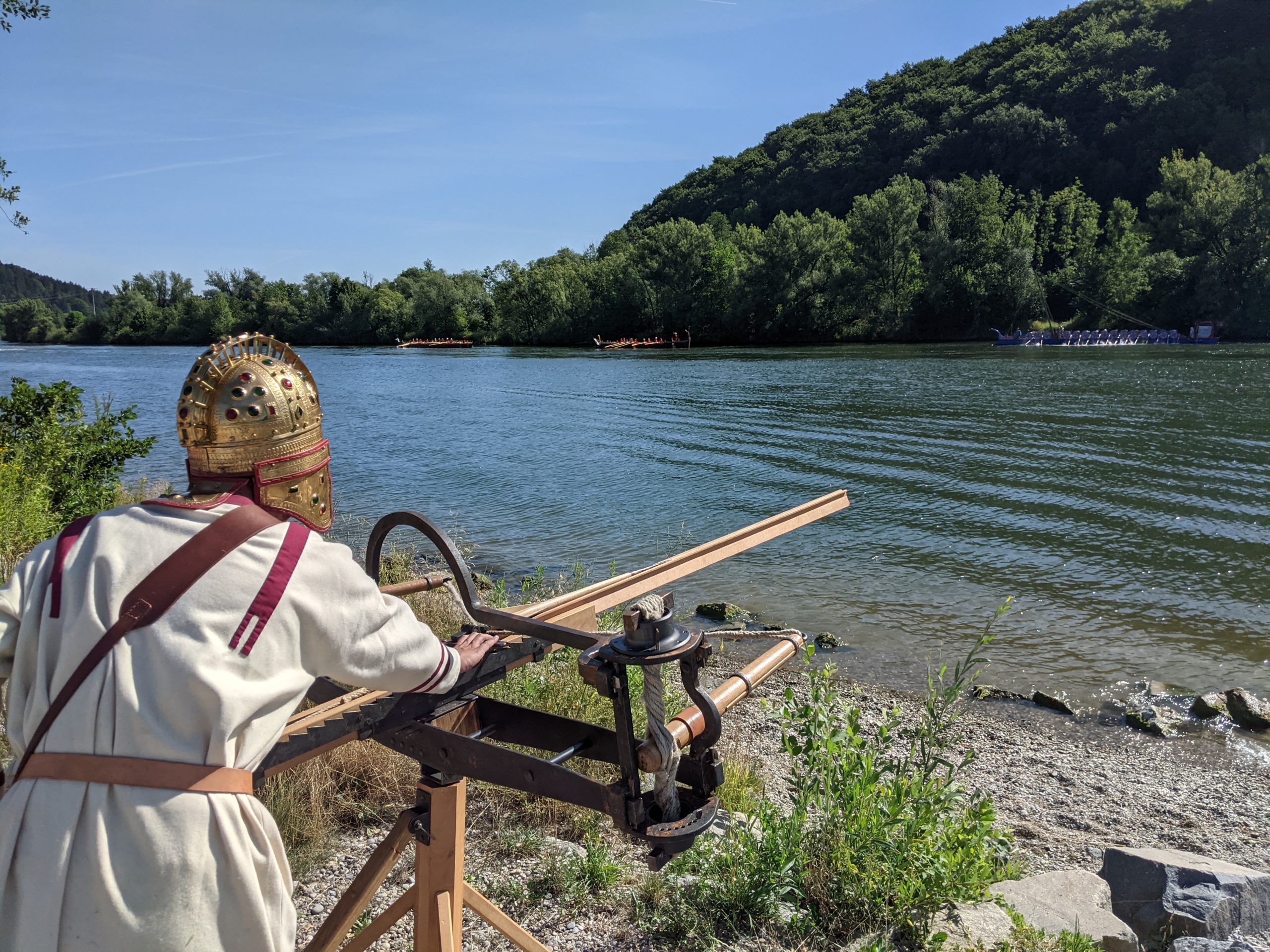 Unter sengender Sonne kämpfen sich die Boote voran. Die Luft flimmert in der Hitze und das Wasser der träge dahinfließenden Donau glitzert hin und wieder, wenn sich Sonnenstrahlen in den kleinen Bugwellen brechen, die die drei Boote vor sich herschieben. Schweiß steht auf der Stirn eines jeden Einzelnen an Bord. Die Männer und Frauen auf der Danuvina alacris und der F.A.N. müssen doppelt hart arbeiten, da die beiden Erlanger Boote nicht vollbesetzt sind. Schlag um Schlag tauchen die Riemen wie aufeinander abgestimmt in das blaue Wasser, treiben die Flussboote vorwärts. Unterwegs können die Besatzungen am Ufer immer wieder Männer in römischen Rüstungen auf Pferden und Frauen in Tuniken erkennen, die sie vom Ufer aus grüßen. Die Gruppe führt auch einen Pferdewagen mit sich. Ein römisches Geschütz, bewacht von Soldaten, ist zudem bedrohlich auf den Fluss und die Boote gerichtet.