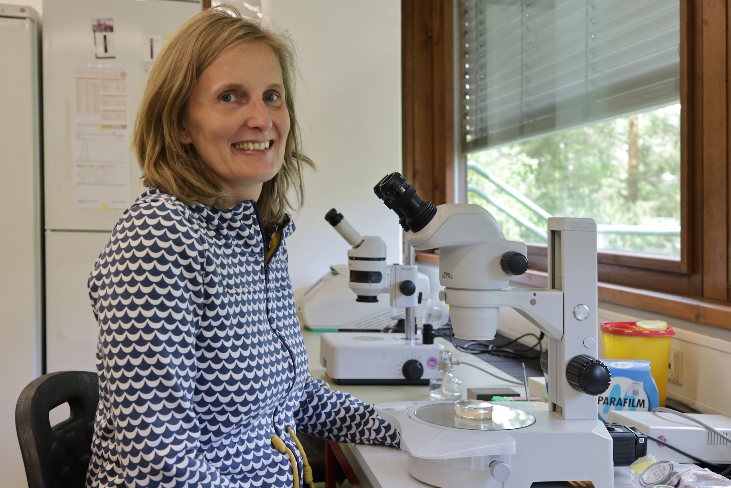 Esther Zanin, eine Frau mittleren alters mit schulterlangen Haaren, sitzt an einem Mikroskop und grinst in die Kamera.