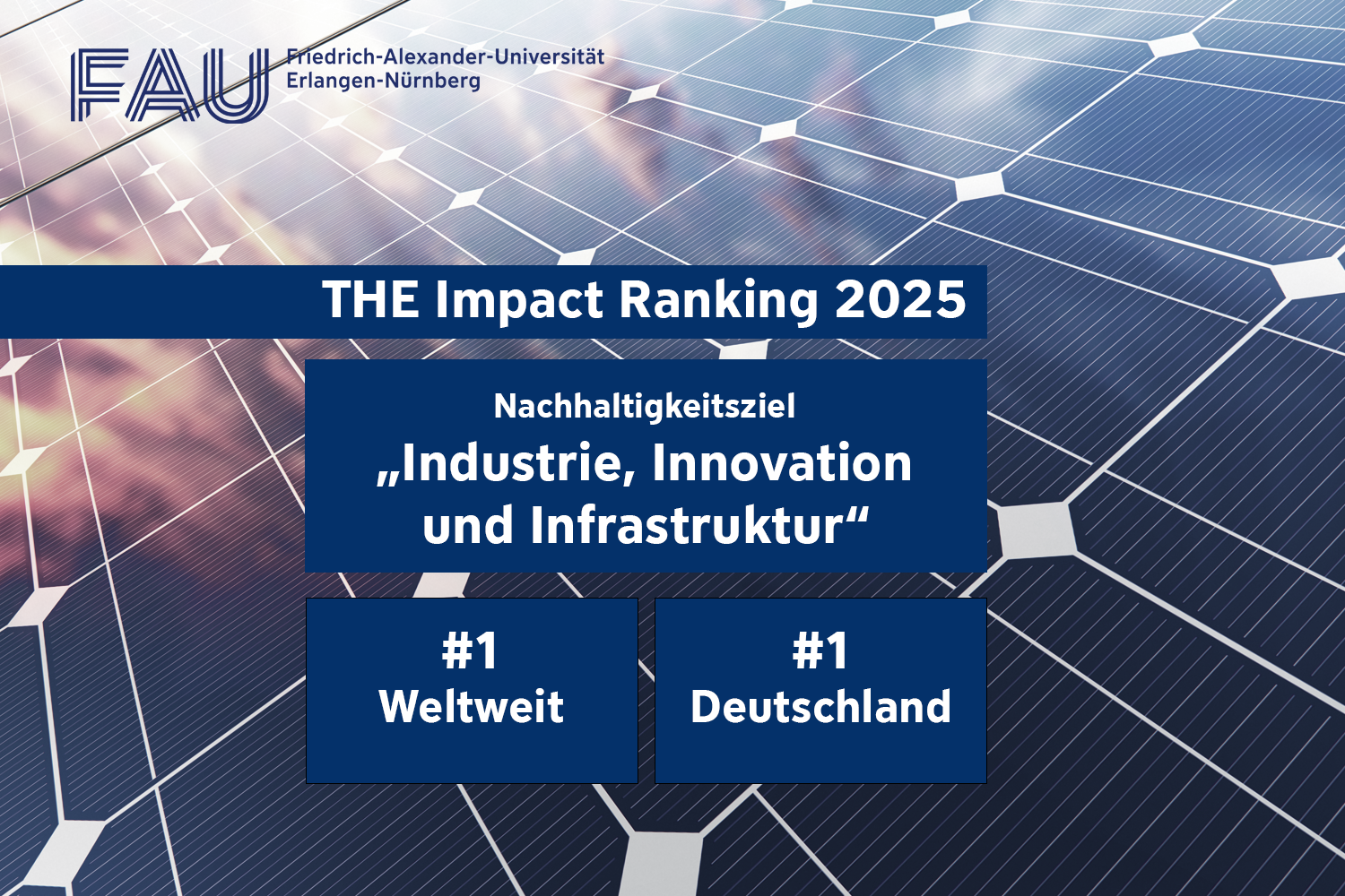 Die Friedrich-Alexander-Universität Erlangen-Nürnberg (FAU) hat ihre Position als eine der innovationsstärksten Universitäten nicht nur in Deutschland, sondern weltweit verteidigt. Auch ihre Beiträge zu nachhaltigem Konsum sowie bezahlbarer und sauberer Energie bescheren der FAU international Spitzenwerte. Das ist das Ergebnis des „Impact Ranking“ des britischen Bildungsmagazins Times Higher Education (THE). Das Ranking bewertet, wie Universitäten auf der ganzen Welt zu den 17 Nachhaltigkeitszielen (Sustainable Development Goals – SDGs) der Vereinten Nationen beitragen.