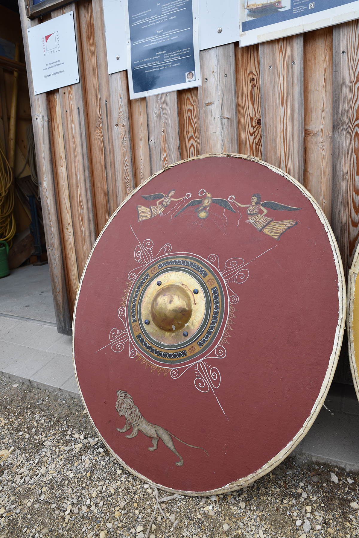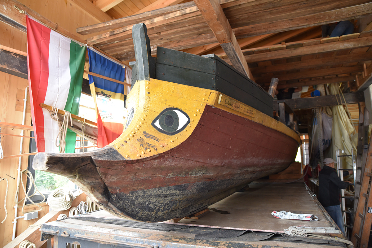 Nach drei Jahren fern der Heimat, kehrt sie zurück. Und die harte Arbeit auf der Donau ist ihr anzusehen: Der Rumpf von Algen überwuchert, einige Riemen und die Reeling beschädigt, die Bemalung in Mitleidenschaft gezogen. „Zeit, dass die Danuvia alacris überholt wird“, sagt Boris Dreyer. Der Professor für Alte Geschichte hat das Römerboot seinem Team aus Studierenden und Freiwilligen der Region nach einem archäologischen Fund aus dem 4. Jahrhundert n. Chr. im Rahmen des mit EU Interreg Programms „Living Danube Limes“ rekonstruiert. Nach einer Fahrt im Sommer 2022 bis nach Rumänien hinab, war Danuvina alacris seither entlang der Donau und auf benachbarten Seen unter anderem für Publikumsfahrten im Einsatz: in Tulln, Österreich, bei Brno in Tschechien, in Bratislava in der Slowakei, wo ihr sogar ein Poststempel gewidmet wurde. Zuletzt war sie in Ungarn, wo sie am 22. September in Baja aus dem Wasser gehoben und mittels Trailer tags darauf zurück an den Schlungenhof gebracht wurde.