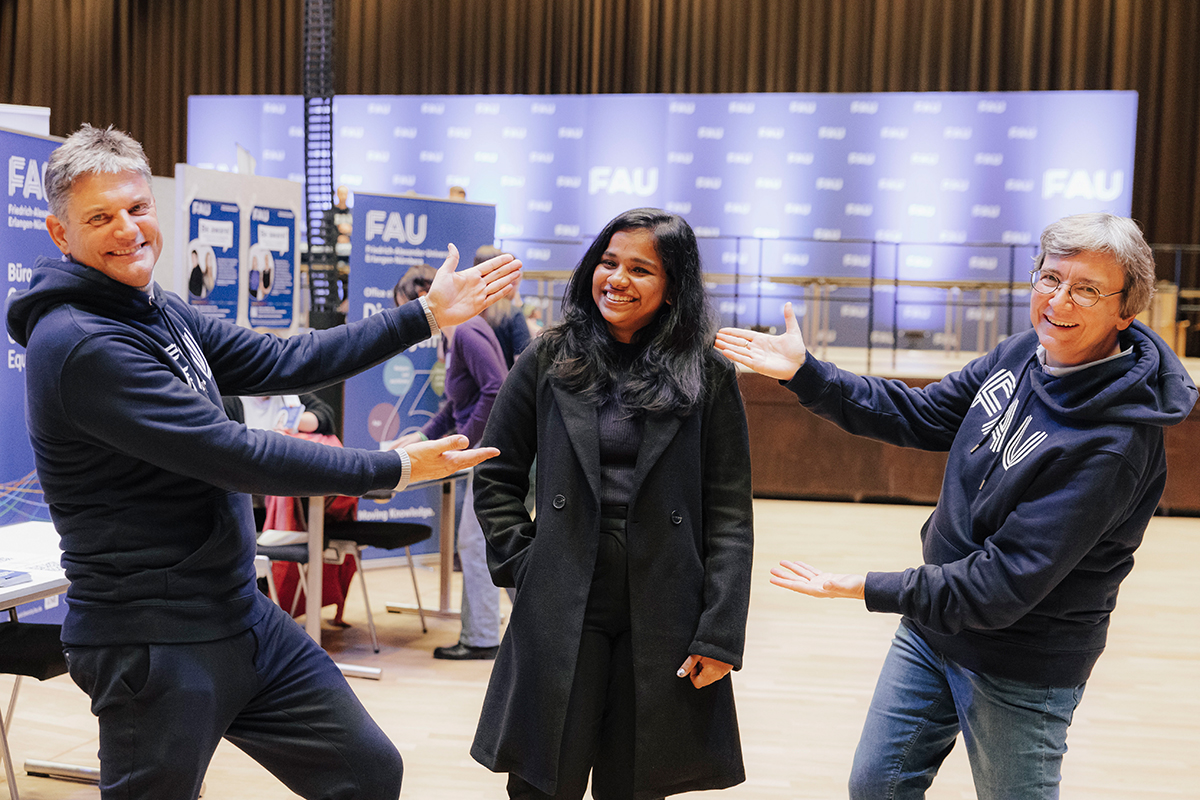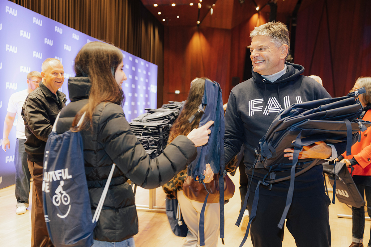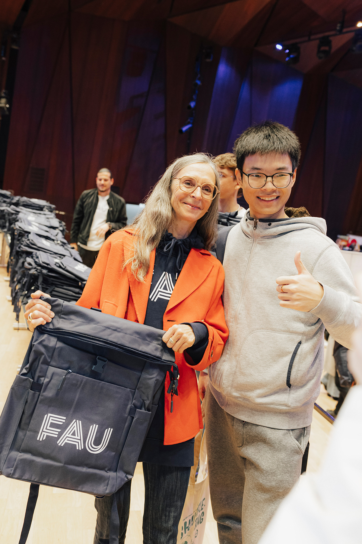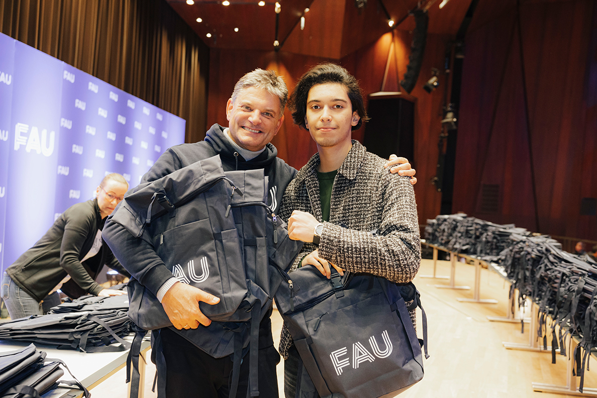 Jedes Jahr heißt die FAU ihre neuen Studierenden mit der FAU Erstsemesterbegrüßung in der Heinrich-Lades-Halle in Erlangen und auf dem Campus der WiSo in Nürnberg willkommen. In Erlangen begrüßte der Präsident und die Universitätsleitung die neuen Erstsemester, es gab ein DJ Set und: Die neuen FAU-Rucksäcke! Des Weiteren standen alle wichtigen Ansprechpartnerinnen und Ansprechpartner für Fragen zur Verfügung, damit der Start ins Studium an der FAU auch gelingt.
