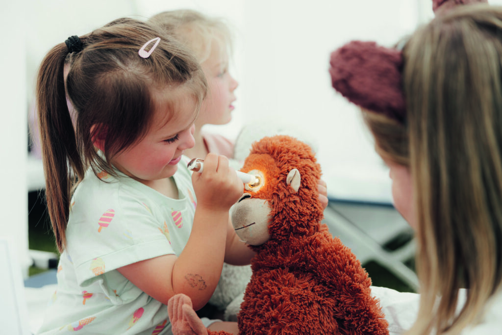 Sie röntgen und impfen, machen einen Ultraschall, kleben Pflaster auf und legen Schienen an. Notfalls operieren sie auch und verschreiben Arznei. Rund 30 Studierende der FAU aus der Human und Zahnmedizin, der Pharmazie und der Medizintechnik bilden ein „bärenstarkes“ Team, das einmal im Jahr zusammenkommt, um im Schlossgarten eine außergewöhnliche Klinik zu betreiben. „Auch Zahnweh beheben wir“, sagt Alexandra Bittner, Medizinstudentin im zehnten Semester. „Es gibt eine Apotheke und ein Labor, und man kann einen echten Krankenwagen besichtigen.“ Besucht wird die Klinik von Kindern im Alter von drei bis acht Jahren – mit ihren „Patienten“, den Kuscheltieren.