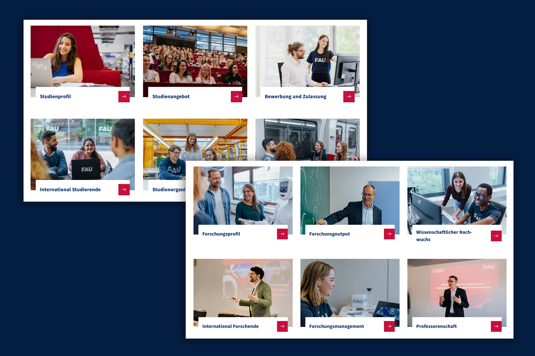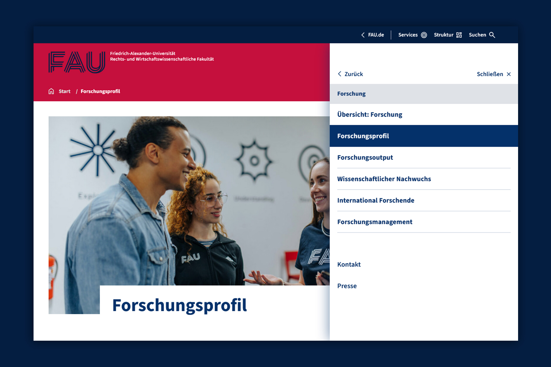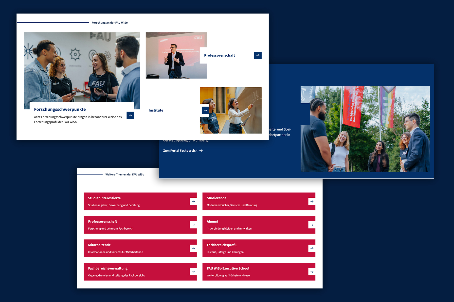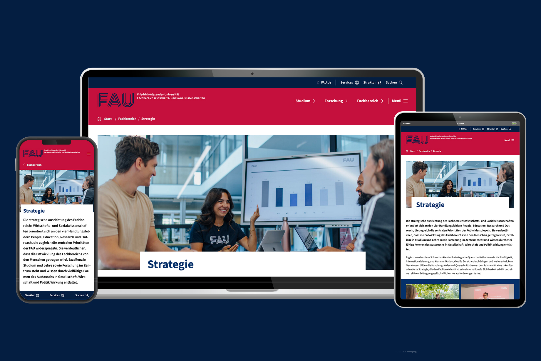 Die neuen Seiten verbinden klare Strukturen, intuitive Navigation und ein visuelles Konzept, das die Identität der FAU transportiert. Authentische Bilder von Studierenden, Forschenden und Mitarbeitenden direkt aus der Lebenswirklichkeit vor Ort machen die Fakultät erlebbar und stärken Nähe und Transparenz. Gleichzeitig setzt das neue Design das Leitmotiv „Wissen bewegen“ sichtbar um. Technisch ist die Seite so umgesetzt, dass sie langfristig zukunftsfähig bleibt: Sie ist barrierefrei, mobiloptimiert, verfügt über eine verbesserte Suche und basiert auf WordPress als flexibel erweiterbarem System. Realisiert wurde sie gemeinsam mit der Hamburger Agentur Mondula (Technik) und dem Berliner Studio Good (Design).