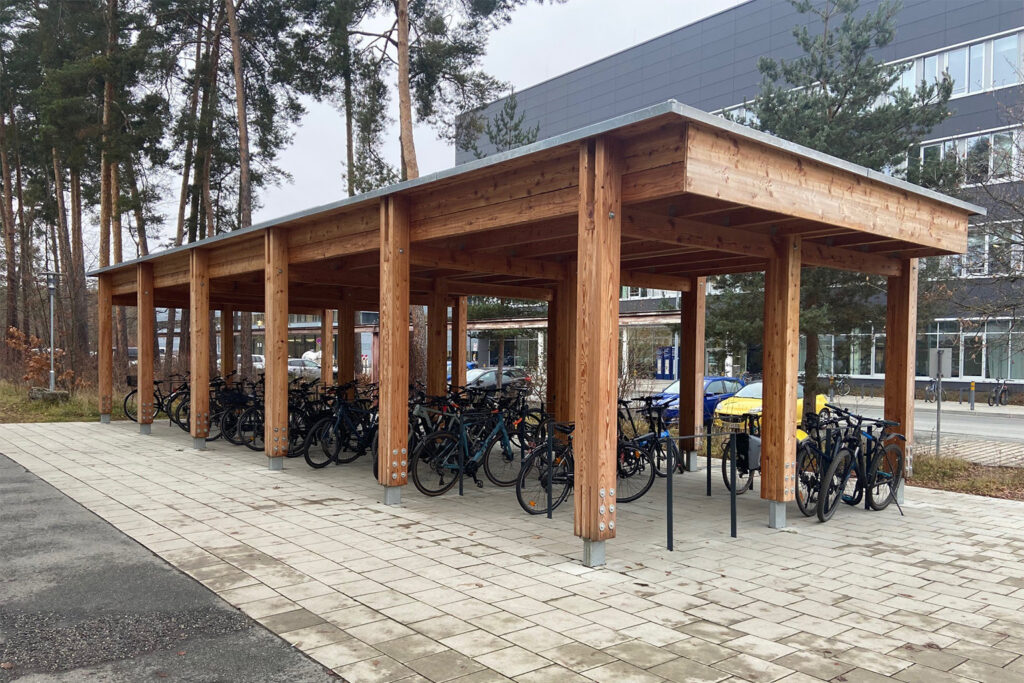 Fahrräder an Bügeln angeschlossen unter Dach aus Holz