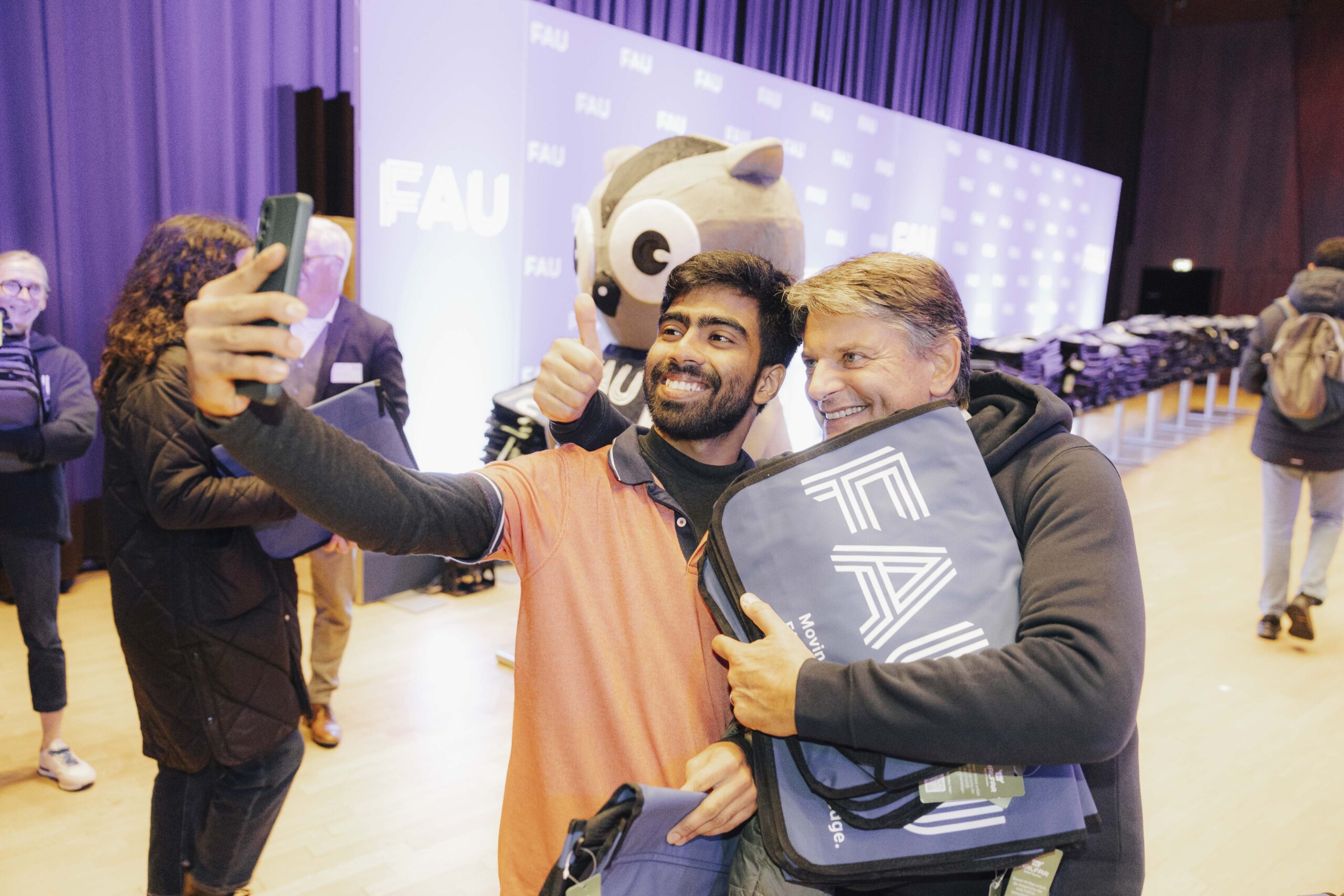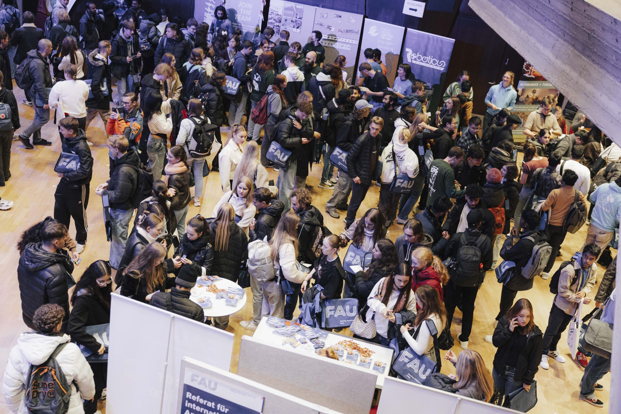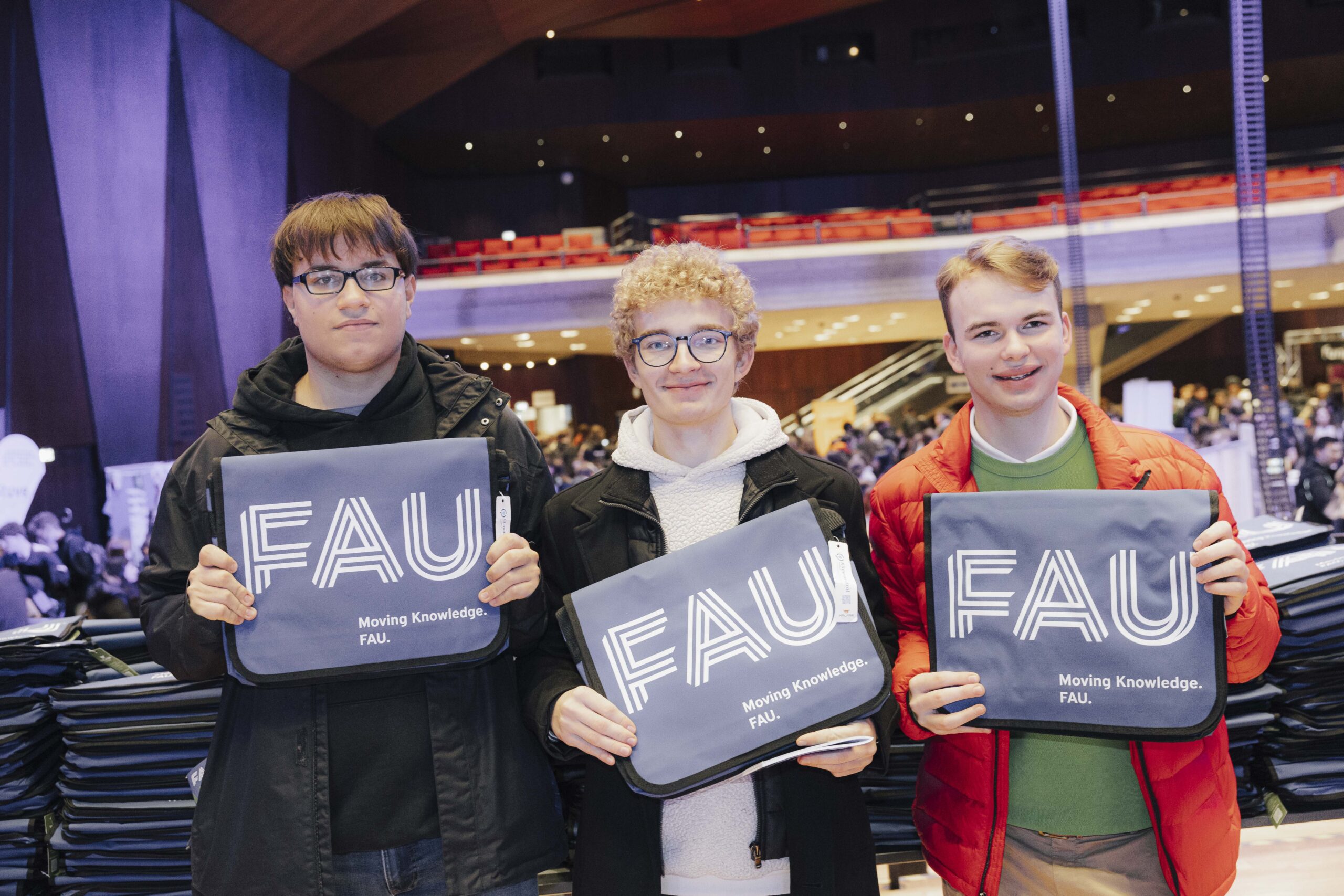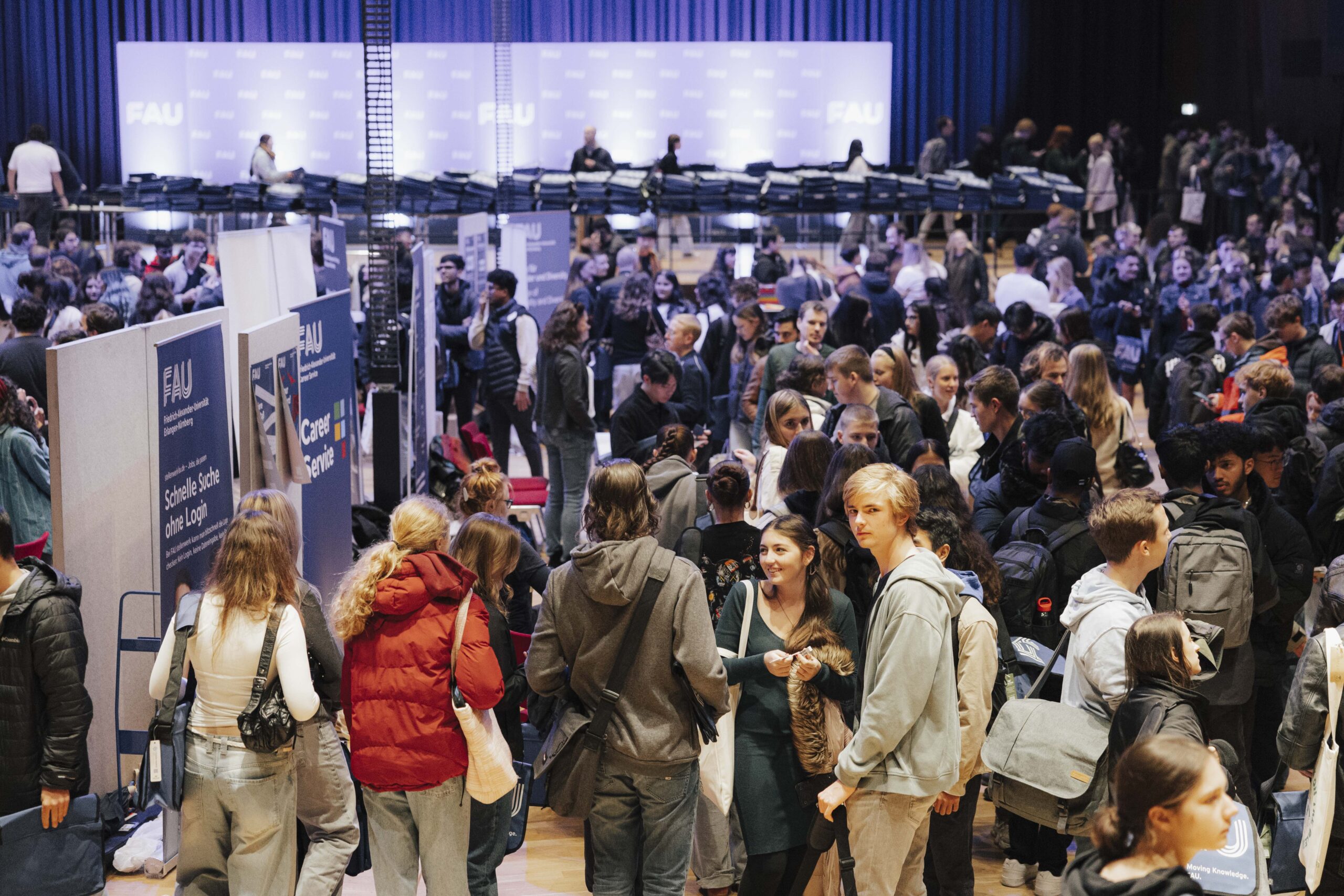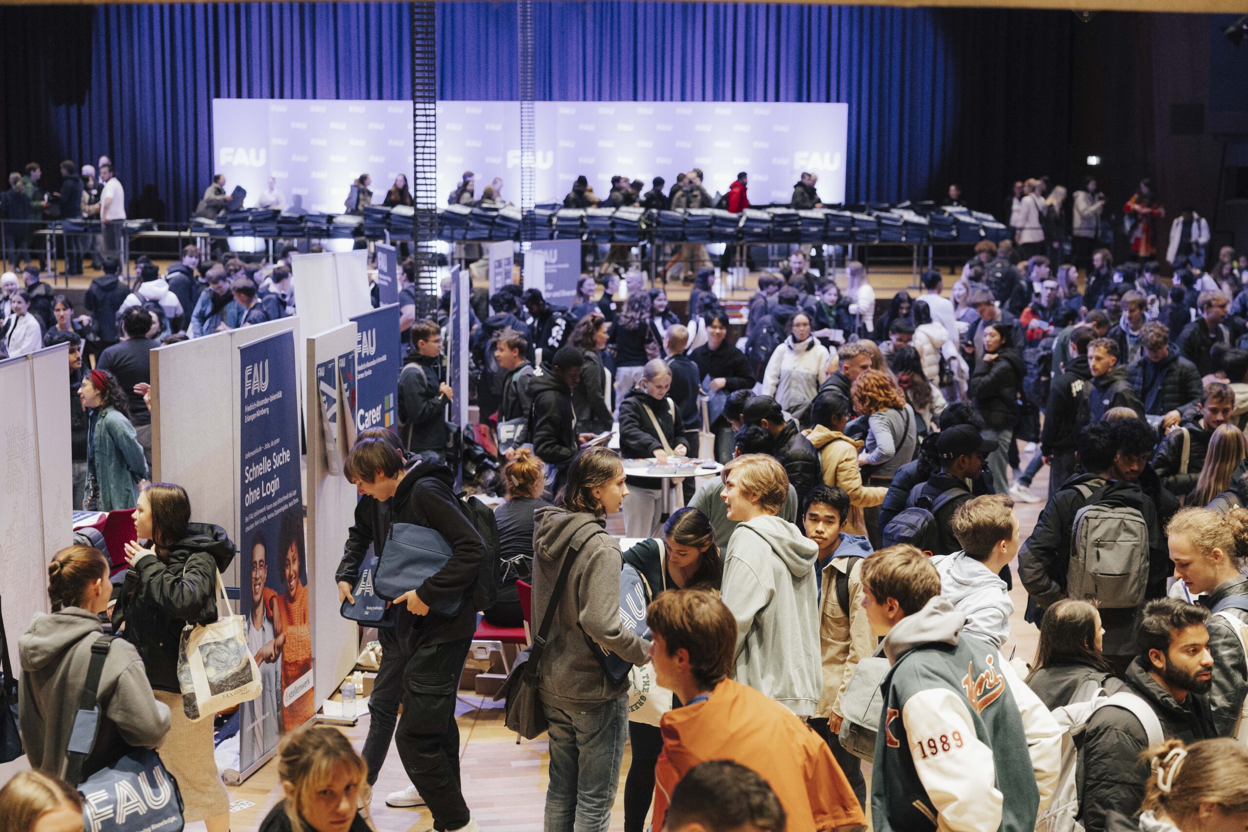 Jedes Jahr heißt die FAU ihre neuen Studierenden mit der FAU Erstsemesterbegrüßung willkommen. Hier erwartet alle die Begrüßung unseres Präsidenten und der gesamten Universitätsleitung, ein cooles DJ-Set und seit 2025 die neuen FAU-Rucksäcke*. Des Weiteren stehen alle wichtigen Ansprechpartnerinnen und Ansprechpartnern für den gelungenen Start ins Studium an der FAU für Fragen zur Verfügung.