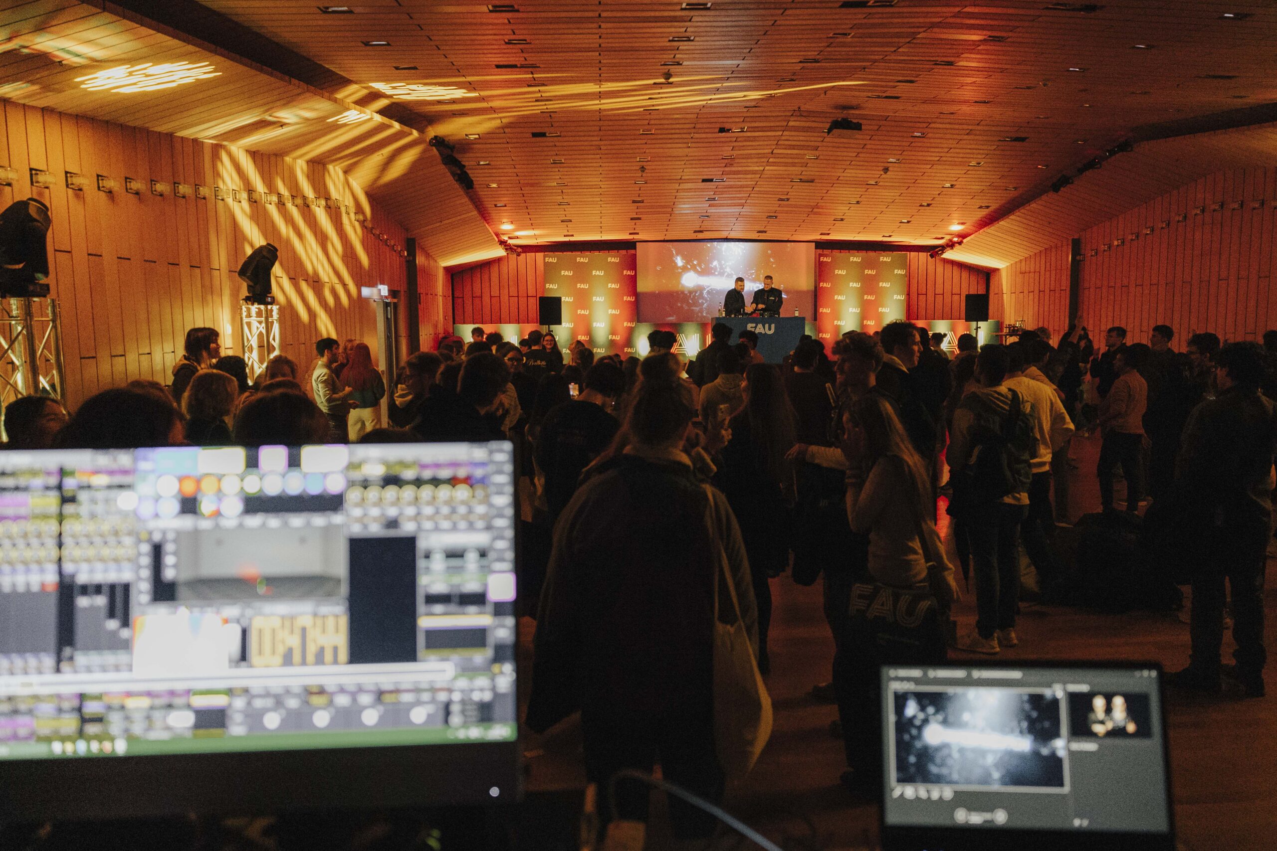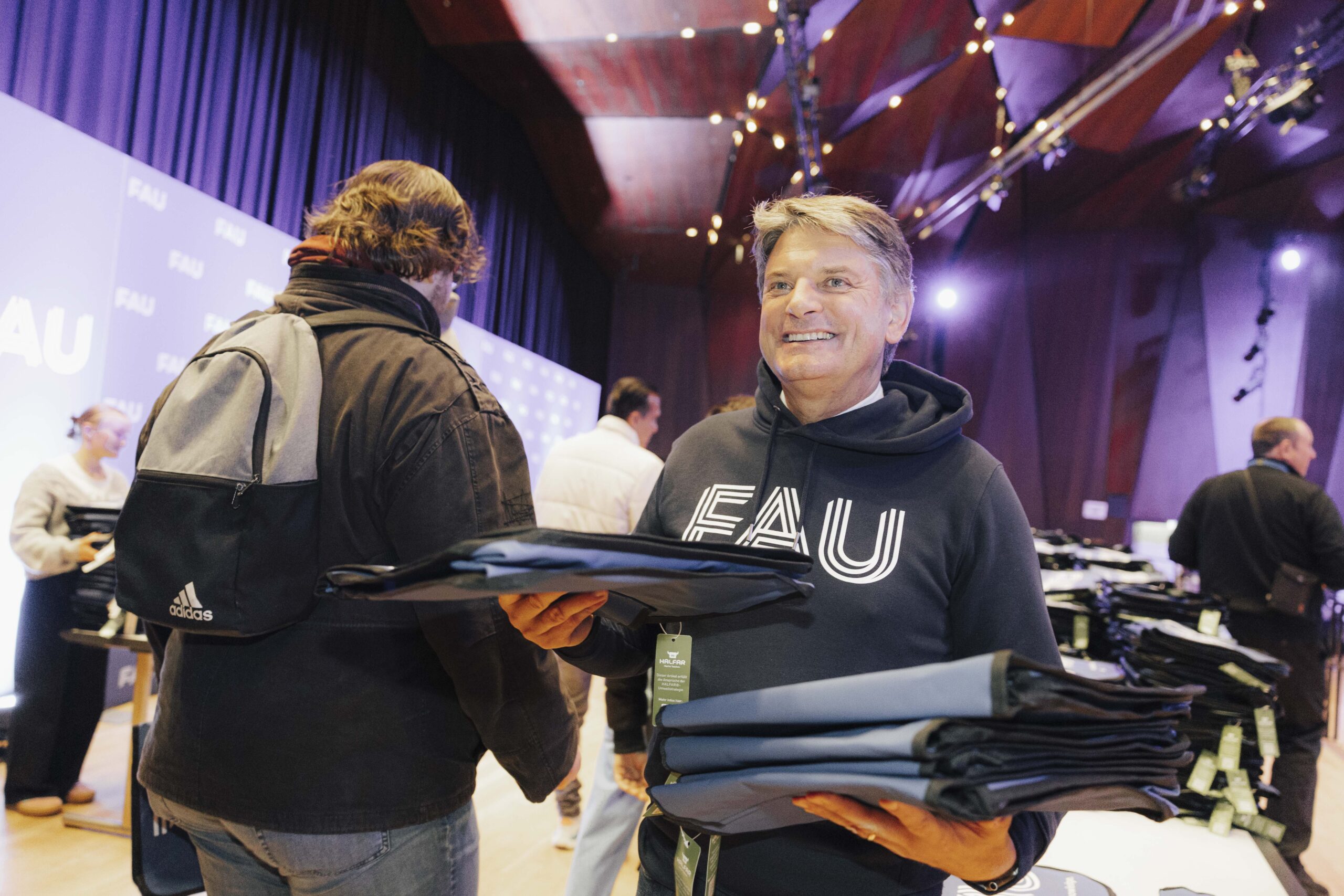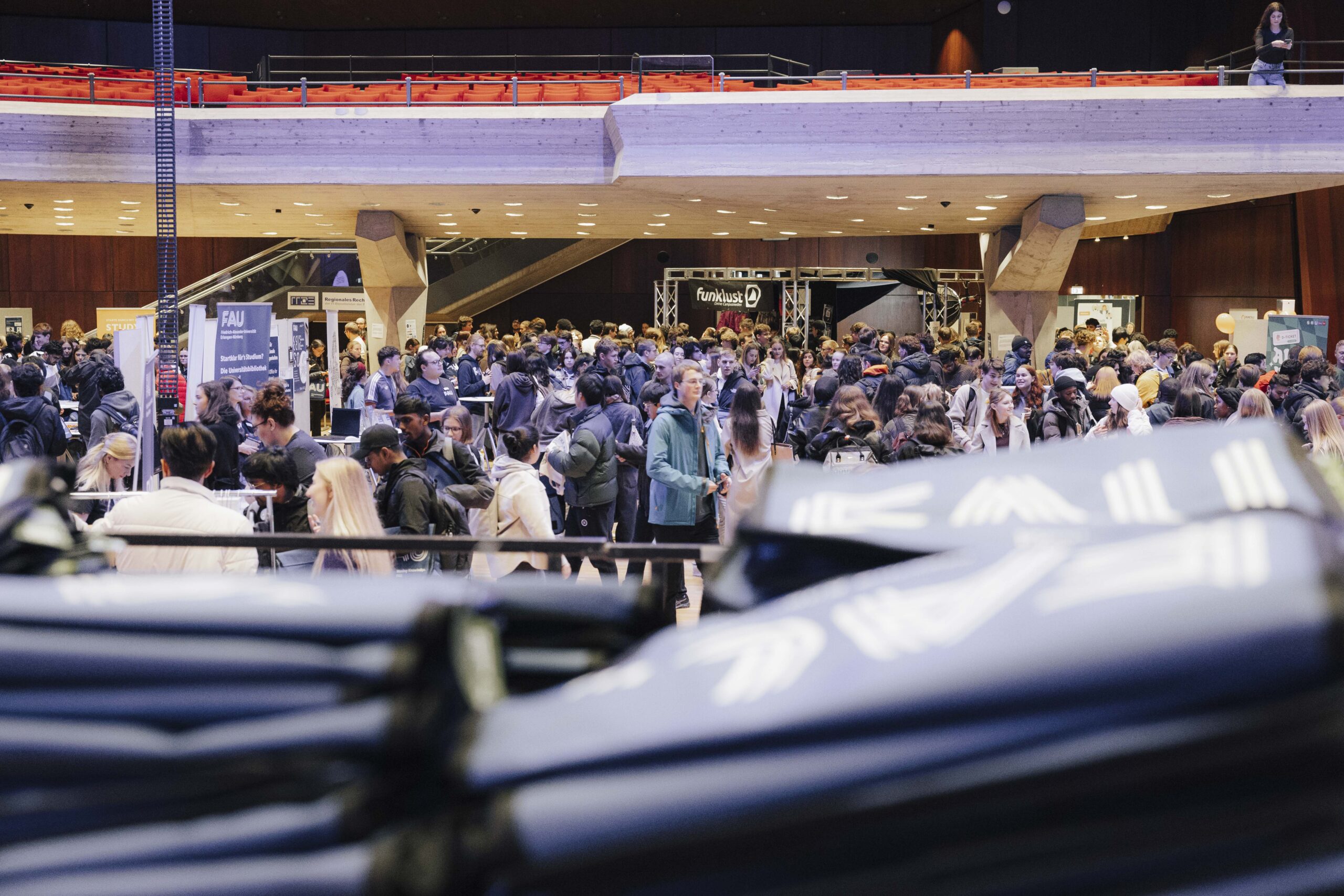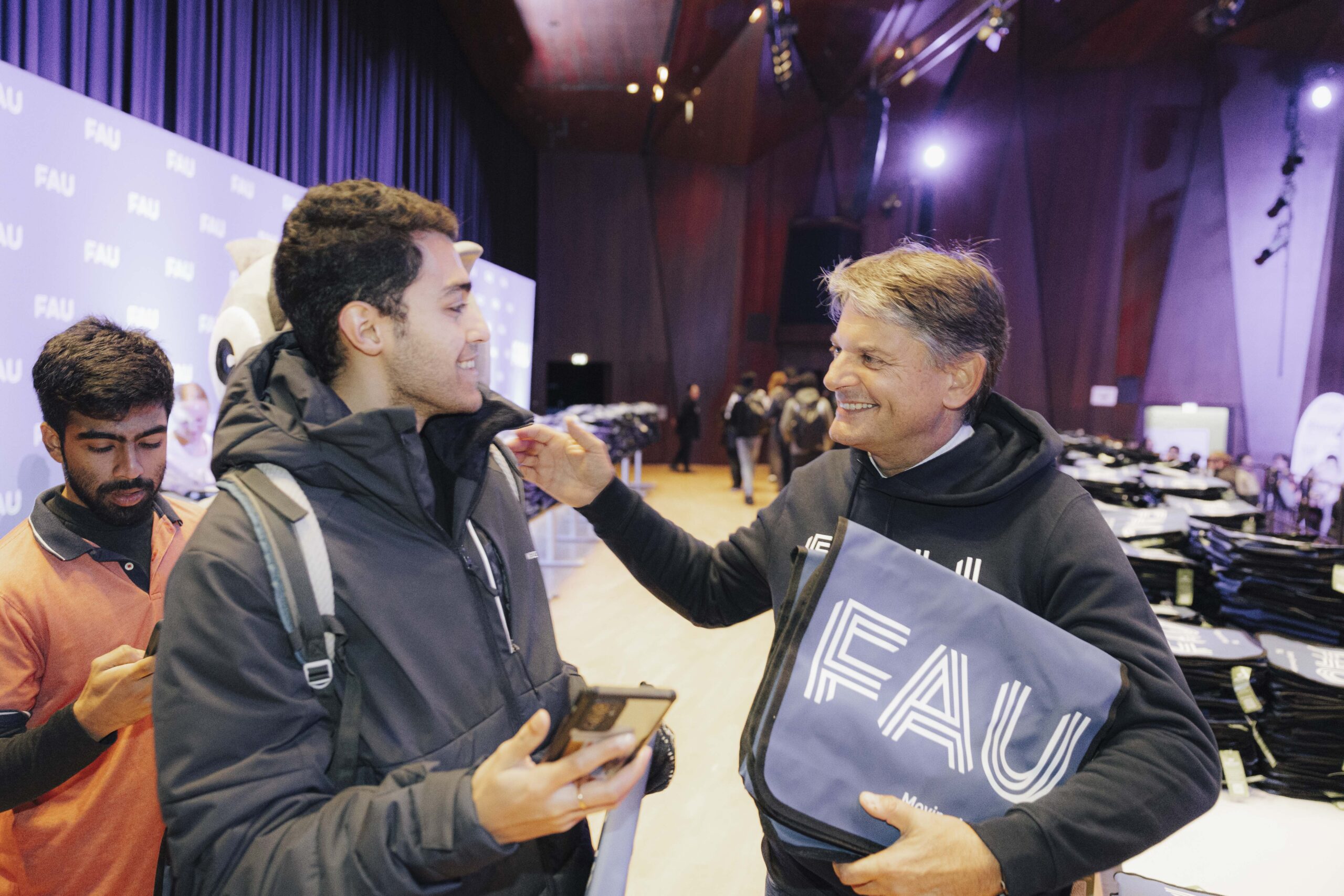 Jedes Jahr heißt die FAU ihre neuen Studierenden mit der FAU Erstsemesterbegrüßung willkommen. Hier erwartet alle die Begrüßung unseres Präsidenten und der gesamten Universitätsleitung, ein cooles DJ-Set und seit 2025 die neuen FAU-Rucksäcke*. Des Weiteren stehen alle wichtigen Ansprechpartnerinnen und Ansprechpartnern für den gelungenen Start ins Studium an der FAU für Fragen zur Verfügung.