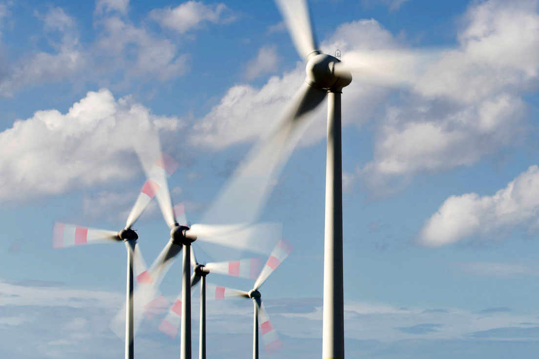 Windräder vor blauem Himmel.