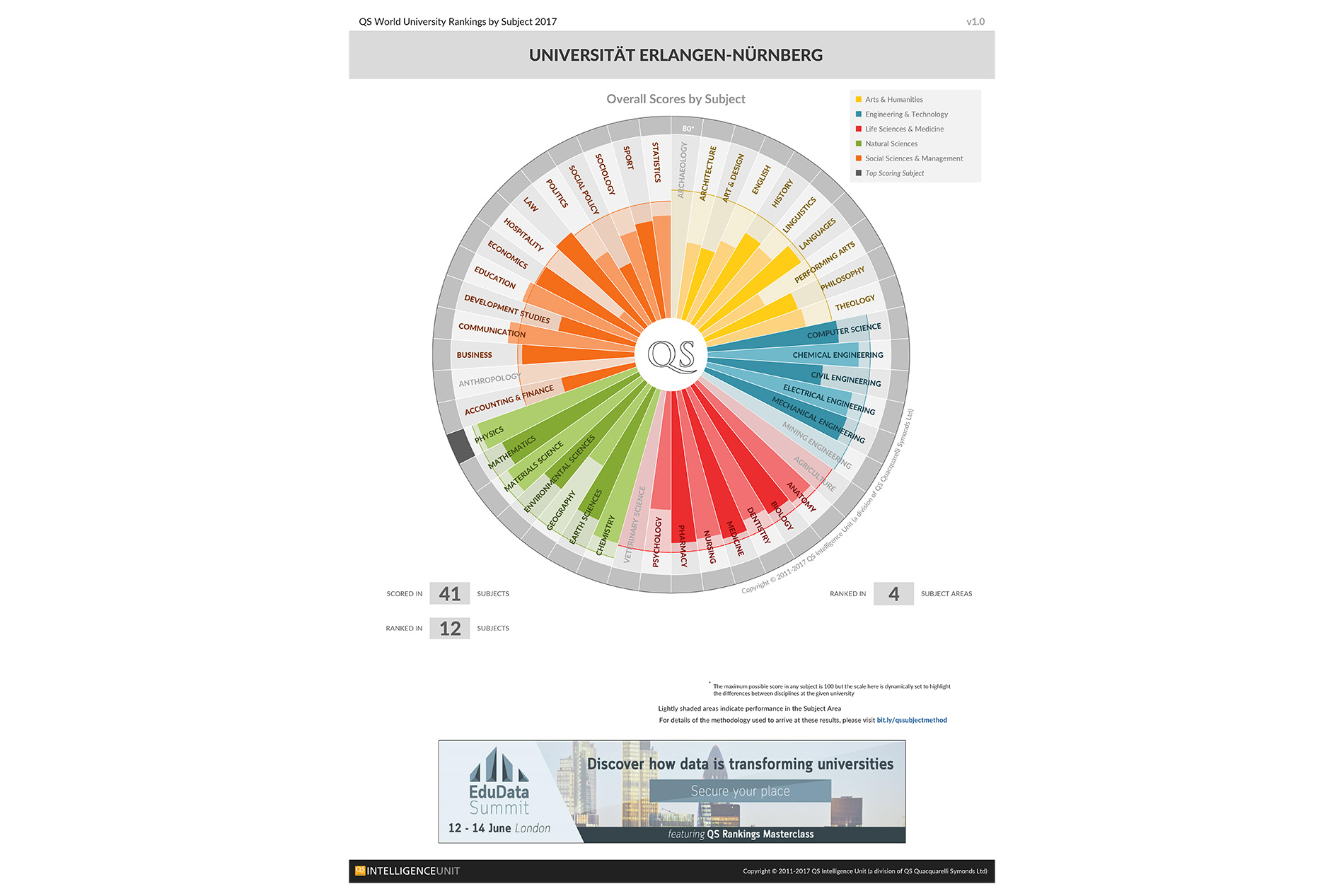 Die FAU gehört in vier Einzelfächern zu den besten 150 Universitäten weltweit. Das geht aus dem aktuellen QS World University Ranking hervor, das der Dienstleister für Bildungsinformationen, QS Quacquarelli Symonds, veröffentlicht hat. Damit werden neben den Material- und Chemieingenieurwissenschaften nun auch die Chemie und Physik unter den Top 150 aufgeführt. In den Bereichen Medizin, Geistes-, […]Die FAU gehört in vier Einzelfächern zu den besten 150 Universitäten weltweit. Das geht aus dem aktuellen QS World University Ranking hervor, das der Dienstleister für Bildungsinformationen, QS Quacquarelli Symonds, veröffentlicht hat. Damit werden neben den Material- und Chemieingenieurwissenschaften nun auch die Chemie und Physik unter den Top 150 aufgeführt. In den Bereichen Medizin, Geistes-, […]